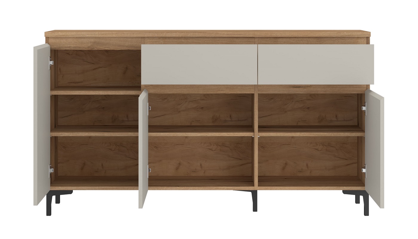 Komoda trzydrzwiowa Exeter EXXK06 to prawdziwy skarb dla osób ceniących porządek. Dwie praktyczne szuflady ułatwiają organizację drobiazgów, a w środku za drzwiami czekają cztery półki, zapewniające mnóstwo miejsca na przechowywanie różnorodnych przedmiotów. To idealne rozwiązanie dla tych, którzy chcą utrzymać ład w swoim otoczeniu, zachowując jednocześnie stylową estetykę.
