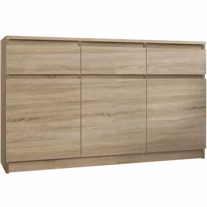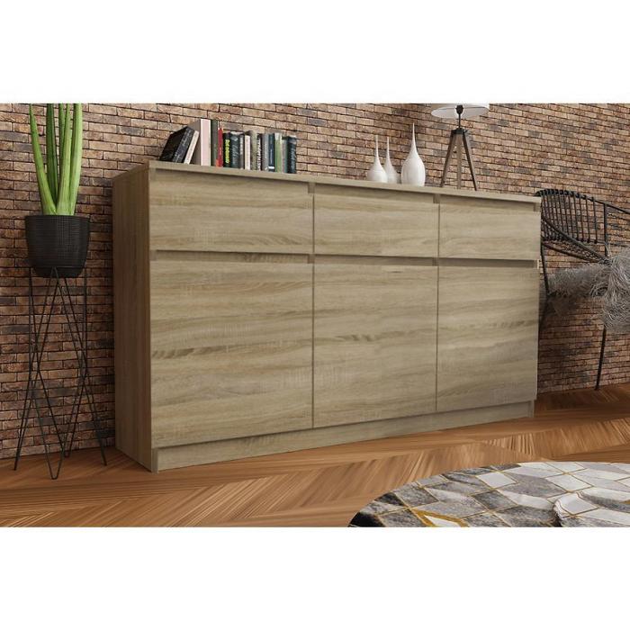 Doskonałym wyborem do pokoju dziennego będzie komoda w kolorze dąb sonoma z serii Merg, materiał wykonania to płyta laminowana . Komoda posiada szafki oraz szuflady dzięki czemu ma łatwy dostęp do wnętrza. Komoda dopełni również wystrój salonu, czy przedpokoju, stanowiąc wygodne miejsce do przechowywania mniejszych i większych rzeczy. Mebel do samodzielnego montażu.
