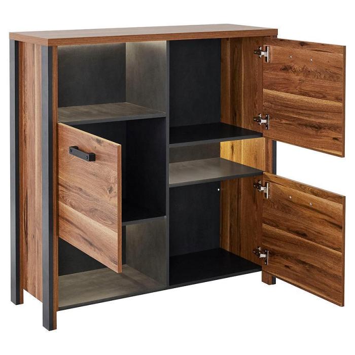 Komoda Buffalo świetnie sprawdzi się do salonu, przedpokoju czy sypialni. Wpasuje się w wiele aranżacji w nowoczesnych wnętrzach, jak również we wnętrzach klasycznych. Posiada zamykane szafki, dzięki czemu ma łatwy dostęp do wnętrza oraz odpowiednią przestrzeń do przechowywania. Charakteryzuje się nowoczesnym wykończeniem.