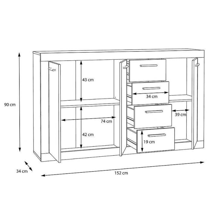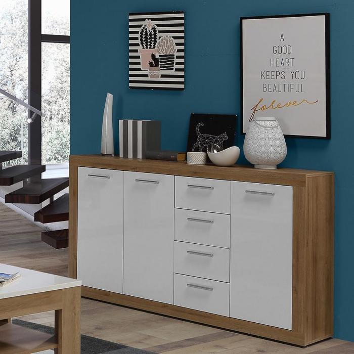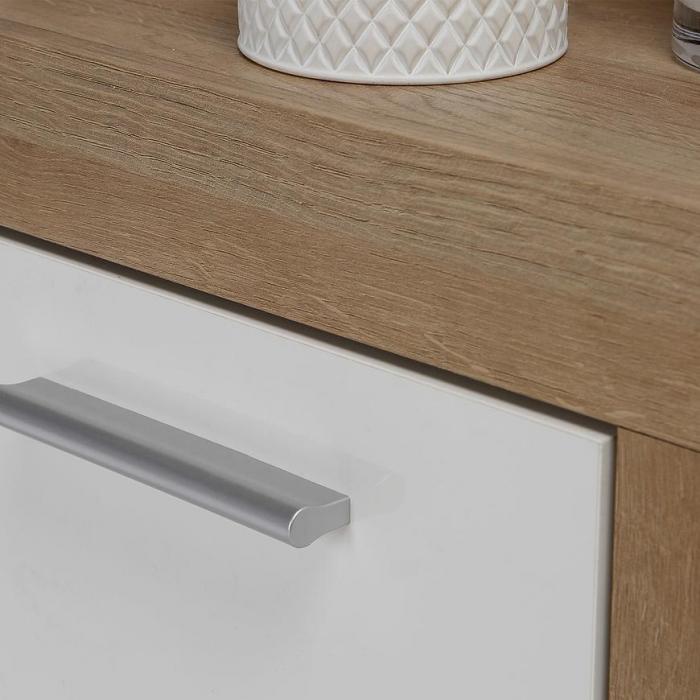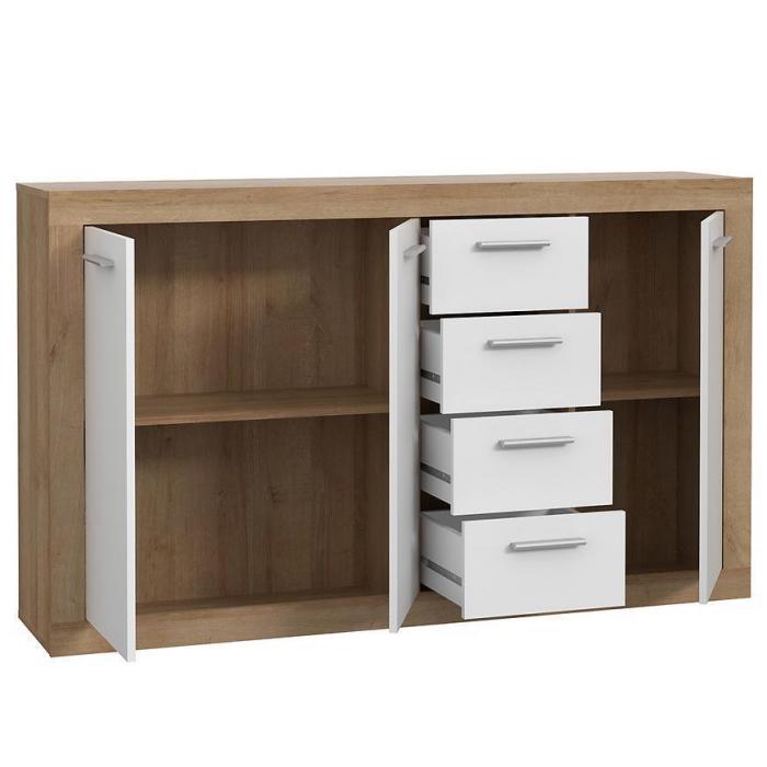 Doskonałym wyborem do pokoju dziennego będzie komoda w kolorze dąb riviera/biały z serii Baccio, materiał wykonania to płyta meblowa. Komoda posiada szafki oraz szuflady dzięki czemu ma łatwy dostęp do wnętrza. Komoda dopełni również wystrój salonu, czy przedpokoju, stanowiąc wygodne miejsce do przechowywania mniejszych i większych rzeczy. Mebel do samodzielnego montażu.