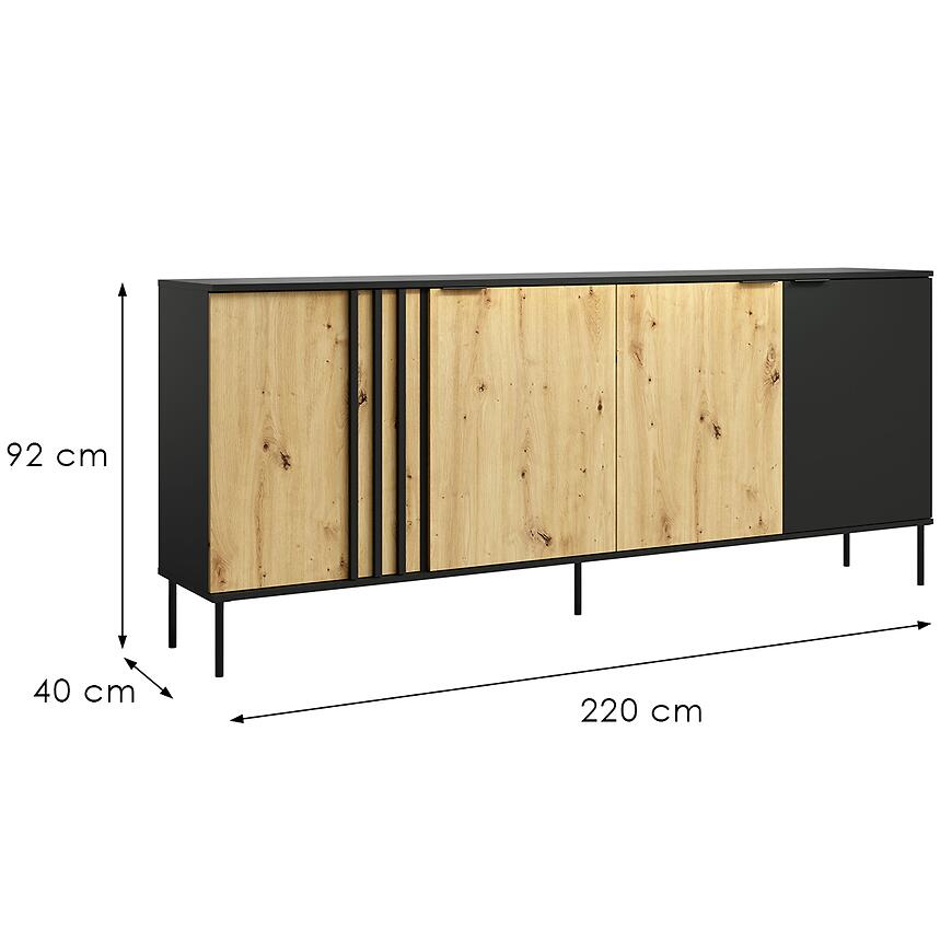 Komoda 4D Rimini 04 w kolorze czarnym z frontami dąb artisan to propozycja dla osób, które szukają stylowego i praktycznego mebla do salonu lub jadalni. Szerokość 220 cm zapewnia dużą przestrzeń do przechowywania, a jednocześnie pozwala stworzyć spójną, elegancką aranżację wnętrza. Połączenie głębokiej czerni z ciepłym odcieniem drewna artisan nadaje meblowi nowoczesny, loftowy charakter, idealnie wpisujący się w aktualne trendy wnętrzarskie.