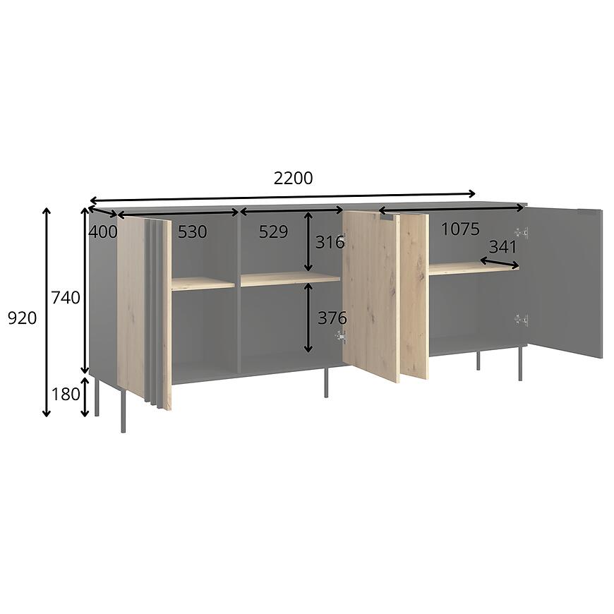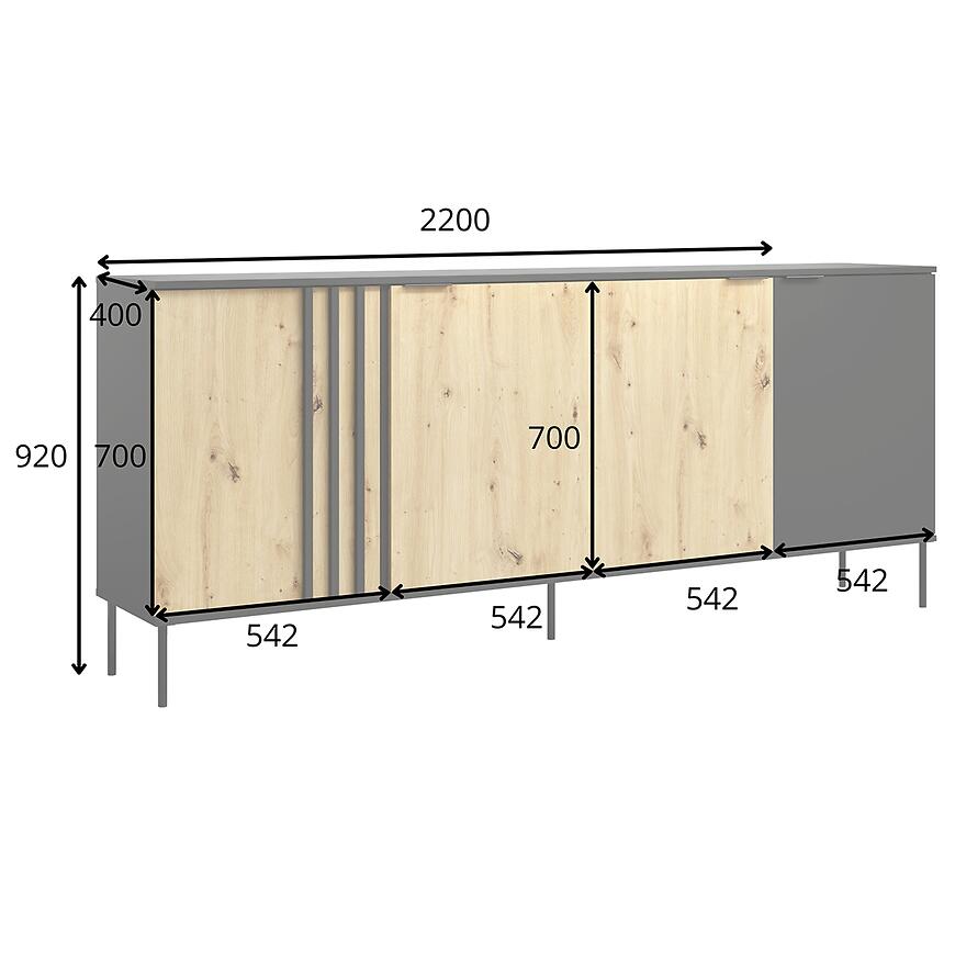 Czterodrzwiowa konstrukcja sprawia, że komoda Rimini 04 oferuje dużą ilość miejsca na przechowywanie. Brak szuflad pozwala na maksymalne wykorzystanie przestrzeni wewnętrznej, co czyni ją doskonałym wyborem na zastawę stołową, tekstylia czy dokumenty. Wymiary (220 cm szerokości, 92 cm wysokości i 40 cm głębokości) zapewniają wygodę użytkowania bez przytłaczania wnętrza.