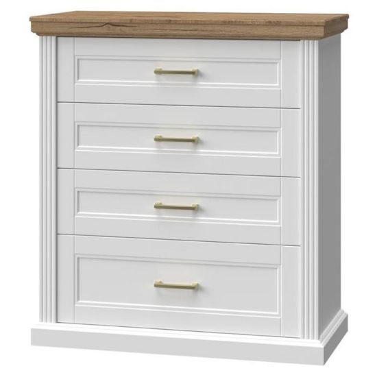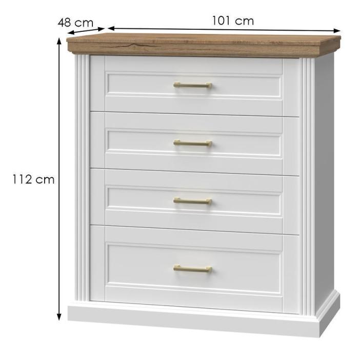 Komoda Tara w kolorze white/pacific walnutc walnut to przede wszystkim nowoczesność i funkcjonalność w jednym. Mebel doskonale sprawdzi się w każdym salonie. Materiał wykonania to płyta wiórowa lakierowana/płyta wiórowa laminowana. Komoda posiada cztery szuflady dzięki czemu ma łatwy dostęp do wnętrza. Wygląd mebli jest nowoczesny, a zarazem uniwersalny. Mebel będzie pasował do wielu pomieszczeń jak np. jadalni czy pokoju dziennego. Meble jest bardzo pojemny, dlatego sprawdzi się w każdym pomieszczeniu - zarówno w sypialni, pokoju dziennym, młodzieżowym, czy też salonie. Mebel do samodzielnego montażu.