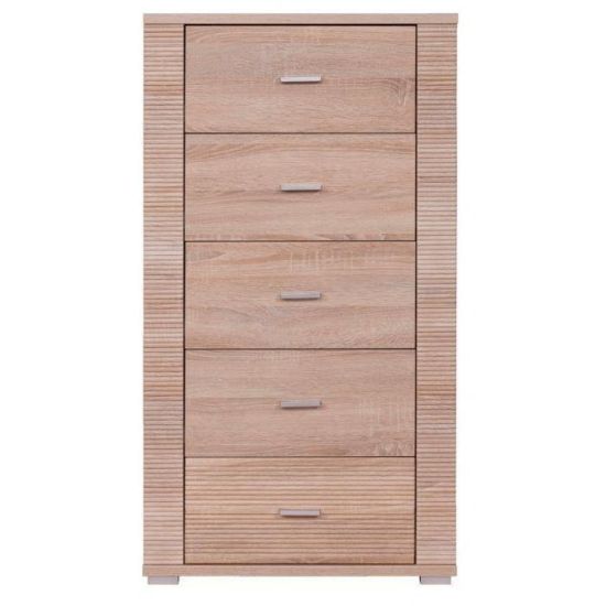 Doskonałym wyborem do pokoju dziennego będzie komoda w kolorze dąb sonoma, materiał wykonania to płyta wiórowa laminowana oklejona obrzeżem PCV. Komoda posiada szuflady dzięki czemu ma łatwy dostęp do wnętrza. Komoda dopełni również wystrój salonu, czy przedpokoju, stanowiąc wygodne miejsce do przechowywania mniejszych i większych rzeczy. Mebel do samodzielnego montażu.
