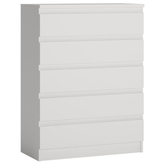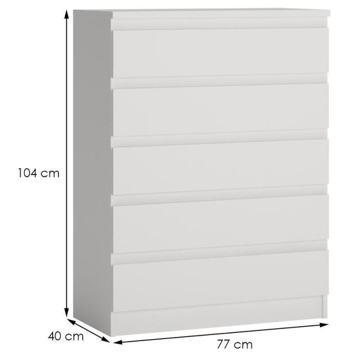 Komoda Viva w kolorze białym to przede wszystkim nowoczesność i funkcjonalność w jednym. Mebel doskonale sprawdzi się w każdym salonie. Materiał wykonania to płyta wiórowa laminowana. Komoda posiada pięć szuflad dzięki czemu ma łatwy dostęp do wnętrza. Wygląd mebli jest nowoczesny, a zarazem uniwersalny. Mebel będzie pasował do wielu pomieszczeń jak np. jadalni czy pokoju dziennego. Meble jest bardzo pojemny, dlatego sprawdzi się w każdym pomieszczeniu - zarówno w sypialni, pokoju dziennym, młodzieżowym, czy też salonie. Mebel do samodzielnego montażu.