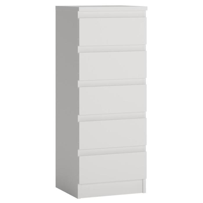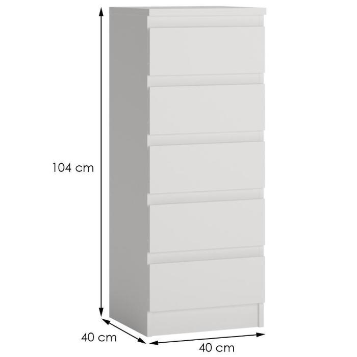Komoda Viva w kolorze białym to przede wszystkim nowoczesność i funkcjonalność w jednym. Mebel doskonale sprawdzi się w każdym salonie. Materiał wykonania to płyta wiórowa laminowana. Komoda posiada pięć szuflad dzięki czemu ma łatwy dostęp do wnętrza. Wygląd mebli jest nowoczesny, a zarazem uniwersalny. Mebel będzie pasował do wielu pomieszczeń jak np. jadalni czy pokoju dziennego. Meble jest bardzo pojemny, dlatego sprawdzi się w każdym pomieszczeniu - zarówno w sypialni, pokoju dziennym, młodzieżowym, czy też salonie. Mebel do samodzielnego montażu.