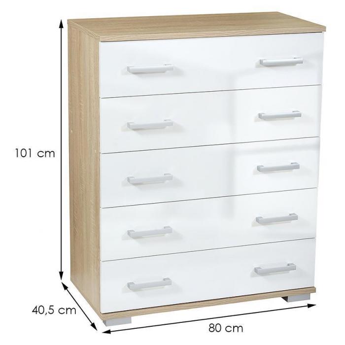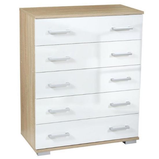 Doskonałym wyborem do pokoju dziennego, czy młodzieżowego będzie komoda w kolorze dąb sonoma/biały, materiał wykonania to płyta MDF/płyta laminowana. Komoda posiada pięć szuflad dzięki czemu ma łatwy dostęp do wnętrza. Komoda dopełni również wystrój salonu, czy przedpokoju, stanowiąc wygodne miejsce do przechowywania mniejszych i większych rzeczy. Mebel do samodzielnego montażu.