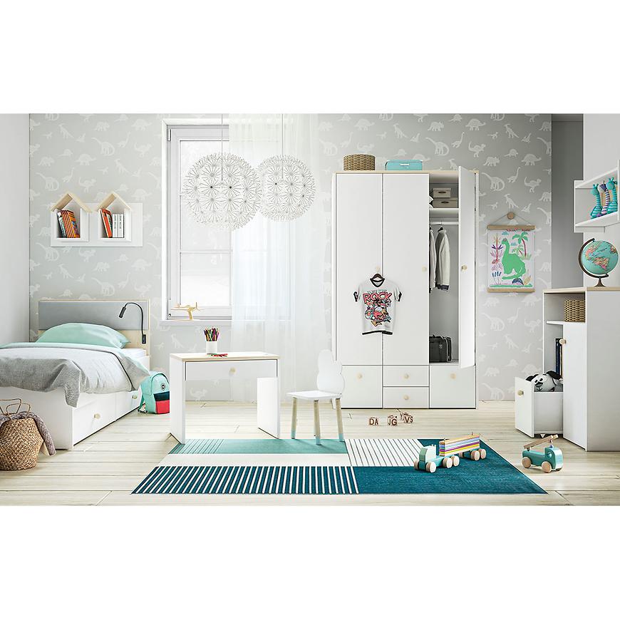 Komoda jest wykończona w jasnym drewnopodobnym odcieniu, co nadaje jej ciepły i przyjemny charakter. Fronty komody są w białym kolorze, co tworzy kontrastowy efekt i dodaje nowoczesnego wyrazu. Zarówno fronty, jak i korpus komody zostały wykonane z płyty wiórowej laminowanej o matowym wykończeniu. To gwarantuje nie tylko solidność, ale także trwałość mebla, który będzie służyć przez wiele lat.