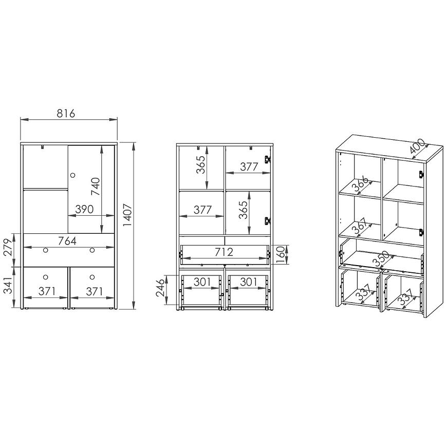 Komoda 82 Elmo posiada dwie półki oraz jedną zamykaną szafkę oraz trzy praktyczne szuflady, co daje mnóstwo miejsca do przechowywania różnych rzeczy, od ubrań po książki czy przedmioty dekoracyjne.