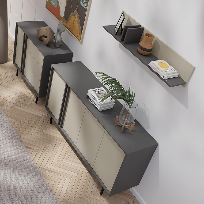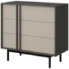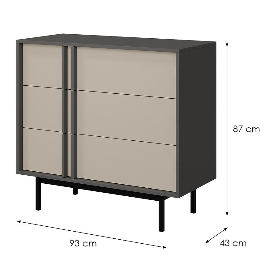 Komoda Alsy 8 o szerokości 90 cm w kolorze beż jasny/antracyt to stylowy mebel, który łączy subtelną kolorystykę z nowoczesnym designem. Idealna do mniejszych wnętrz, zapewnia funkcjonalne przechowywanie i elegancki akcent w aranżacji.