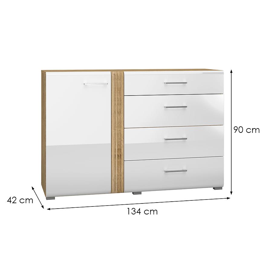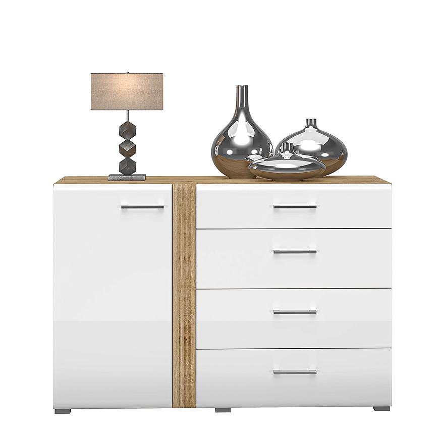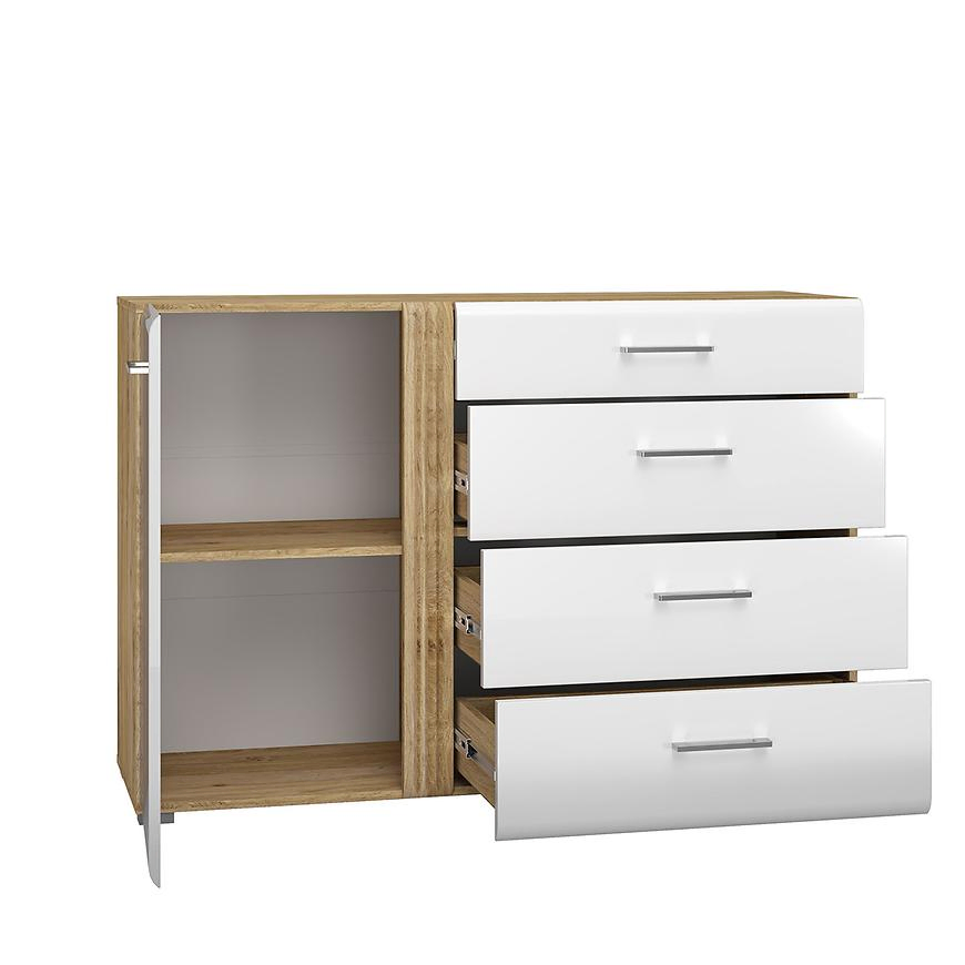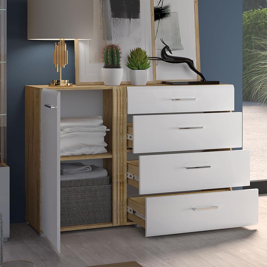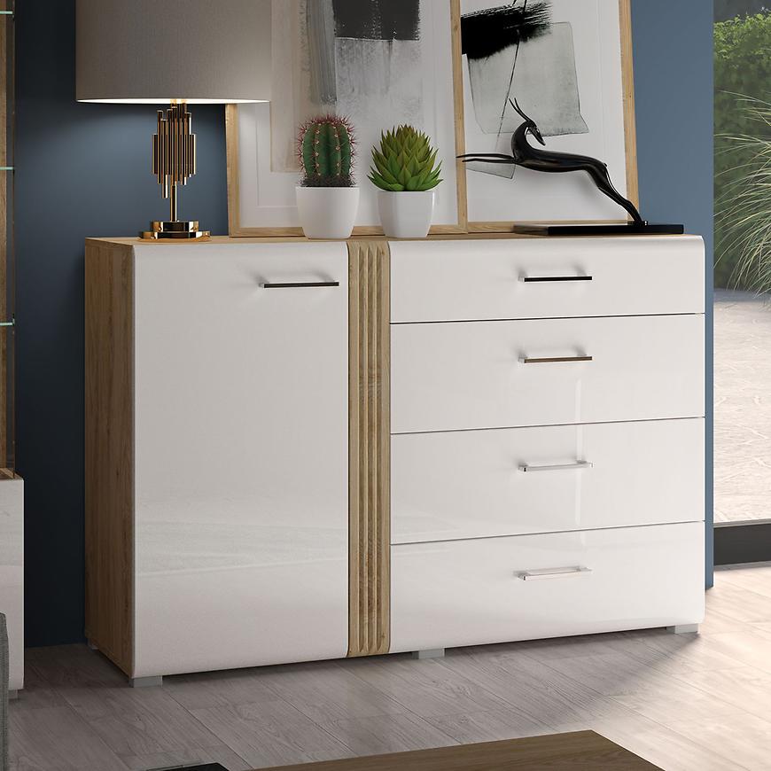 Komoda Adagio 04 to designerskie i nowoczesne rozwiązanie, które doda stylu i elegancji do Twojego wnętrza. Dostępna w wybarwieniu dąb castello i biały połysk, ta jednodrzwiowa komoda wyróżnia się unikalnym połączeniem kolorów, które nadaje jej wyjątkowego charakteru.
