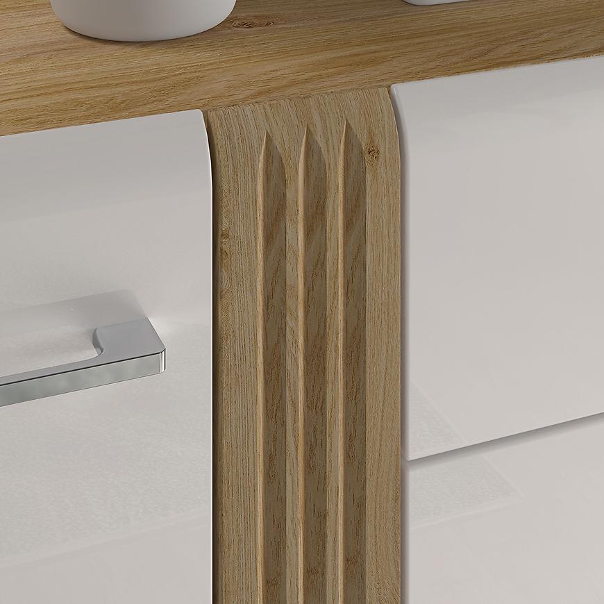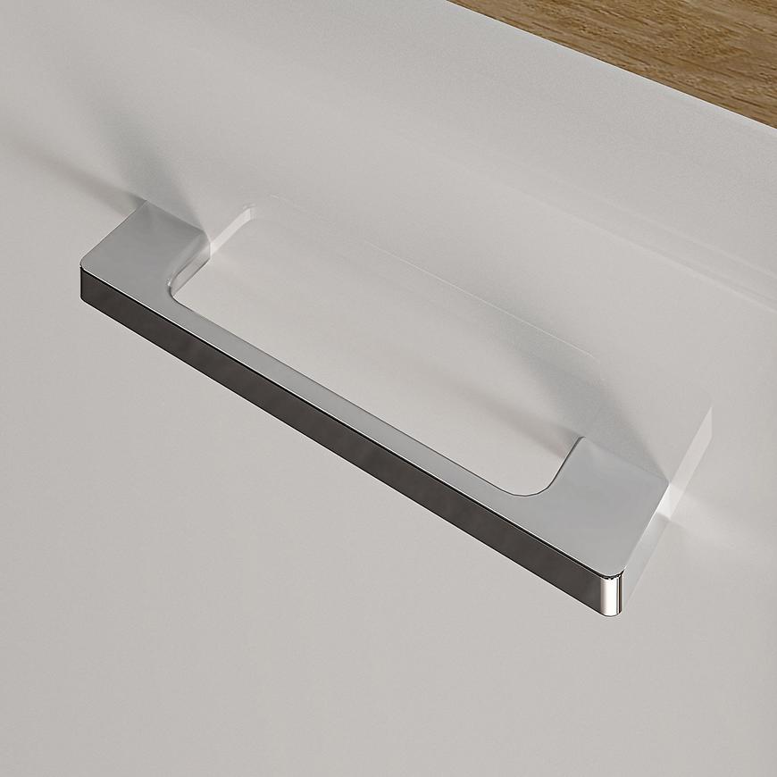 Srebrne uchwyty dodają komodzie Adagio 04 eleganckiego wykończenia. Stanowią nie tylko funkcjonalny element, ale również stylowy akcent, który doskonale komponuje się z dębem castello i białym połyskiem. To szczegół, który przyciąga wzrok i nadaje komodzie nowoczesnego charakteru.