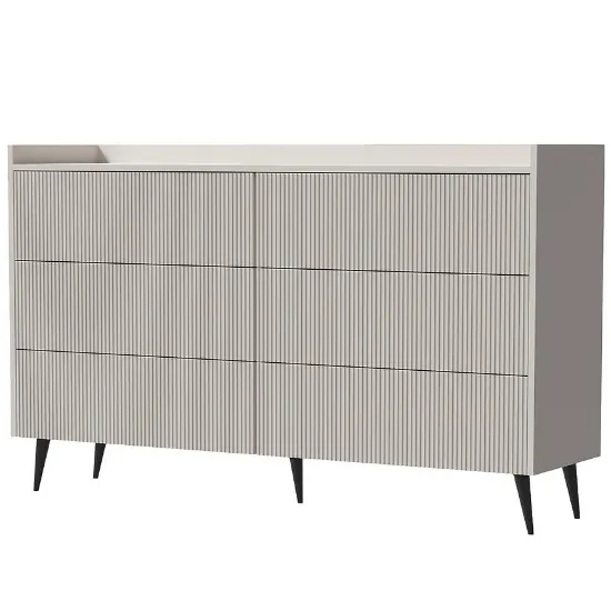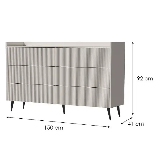 Komoda Ademo Kaszmir wykonana jest z wytrzymałej płyty wiórowej laminowanej, co gwarantuje odporność na uszkodzenia oraz łatwość w codziennym użytkowaniu. Konstrukcja wsparta na elementach z metalu zapewnia stabilność i długowieczność, co czyni z niej mebel na lata. Dzięki przemyślanej konstrukcji komoda łączy estetykę z funkcjonalnością, oferując przestrzeń do przechowywania w eleganckiej formie.