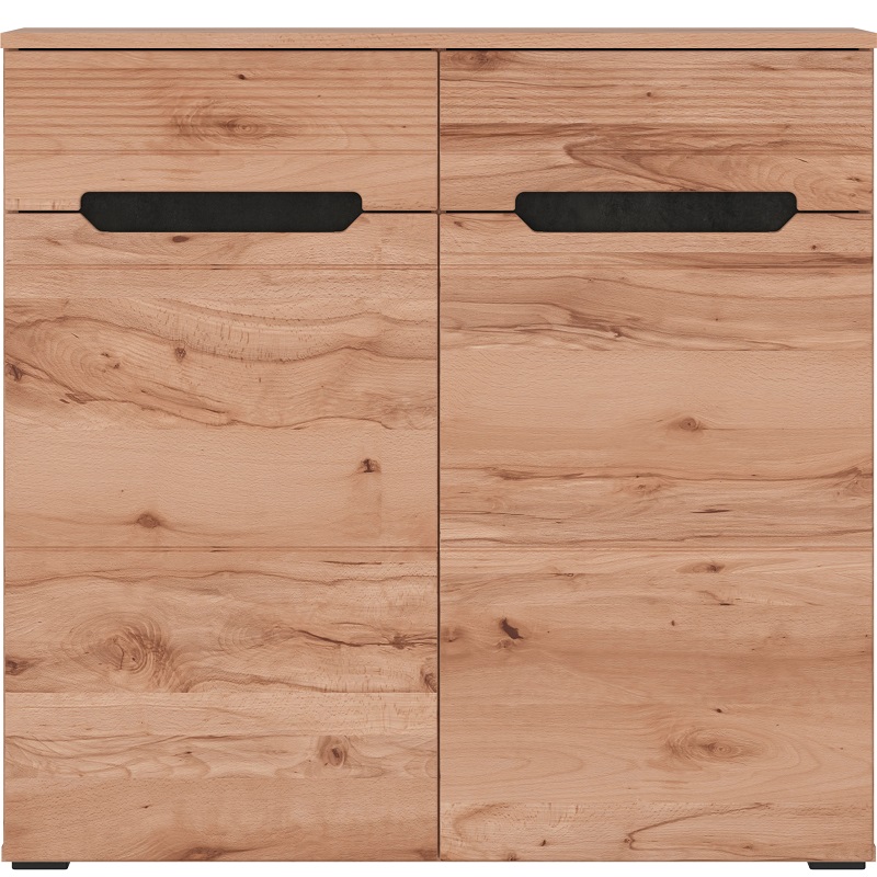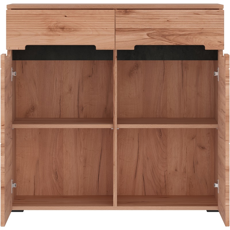 Komoda Alana ALAK04 jest meblem dwudrzwiowym, co zapewnia łatwy dostęp do przestrzeni wewnętrznej. Za drzwiami znajdują się dwie praktyczne półki, które oferują mnóstwo miejsca do przechowywania różnych przedmiotów, takich jak książki, dokumenty czy akcesoria codziennego użytku. Półki te są idealnie rozmieszczone, co pozwala na maksymalne wykorzystanie dostępnej przestrzeni, a jednocześnie umożliwia utrzymanie porządku. Dodatkowo komoda wyposażona jest w dwie pojemne szuflady, które stanowią doskonałe miejsce na drobniejsze przedmioty, takie jak klucze, ładowarki, czy inne akcesoria, które chcemy mieć zawsze pod ręką.