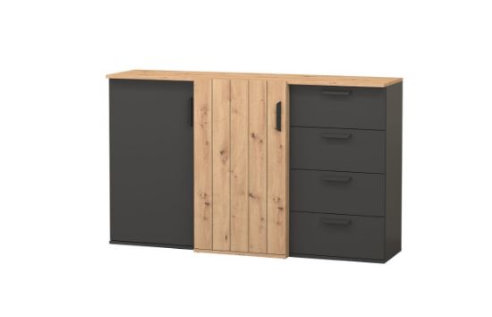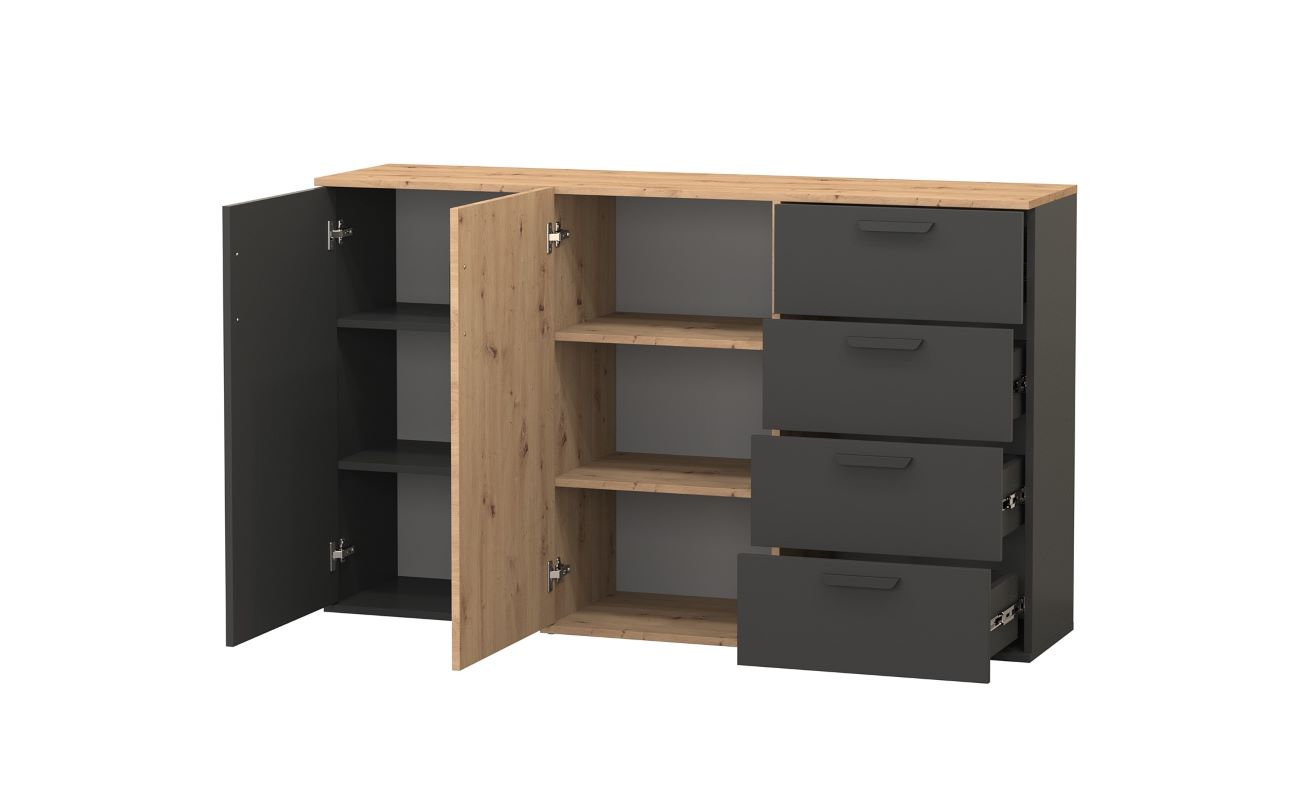 Jedną z głównych cech komody Alanis jest jej elegancki design oparty na połączeniu dwóch wyjątkowych kolorów - dąb artisan i antracyt. Korpus komody utrzymany jest w odcieniu dąb artisan, który nadaje meblowi naturalny, ciepły wygląd, podczas gdy fronty drzwi i szuflad w kolorze antracytu dodają nuty nowoczesności i elegancji. To połączenie kolorów sprawia, że komoda doskonale pasuje do różnych stylów aranżacji wnętrz, od nowoczesnych po klasyczne.