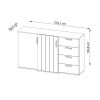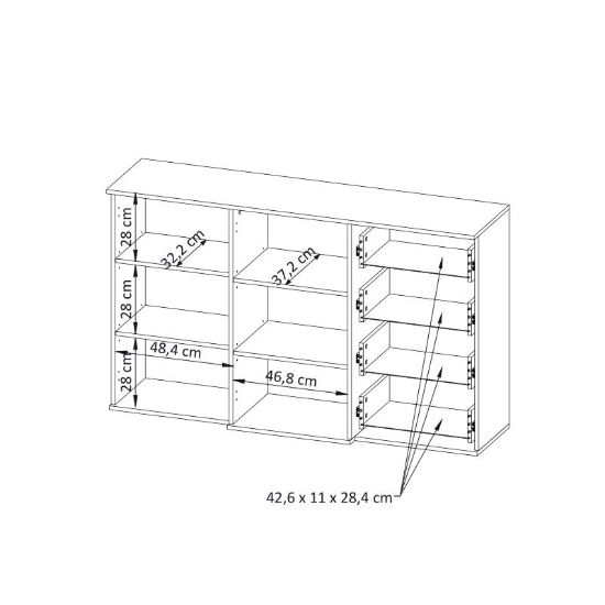 Komoda Alanis to nie tylko elegancja, ale także funkcjonalność. Jej dwudrzwiowa konstrukcja skrywa wewnątrz cztery półki, które pozwalają na uporządkowanie i przechowywanie różnorodnych przedmiotów. Dodatkowo, cztery szuflady umieszczone na górnej części komody doskonale sprawdzają się do przechowywania mniejszych akcesoriów, dokumentów czy biżuterii. Drzwi komody są uchylne, co ułatwia dostęp do wnętrza, jednocześnie zachowując elegancki wygląd mebla.
