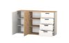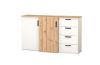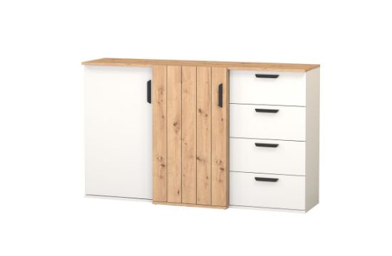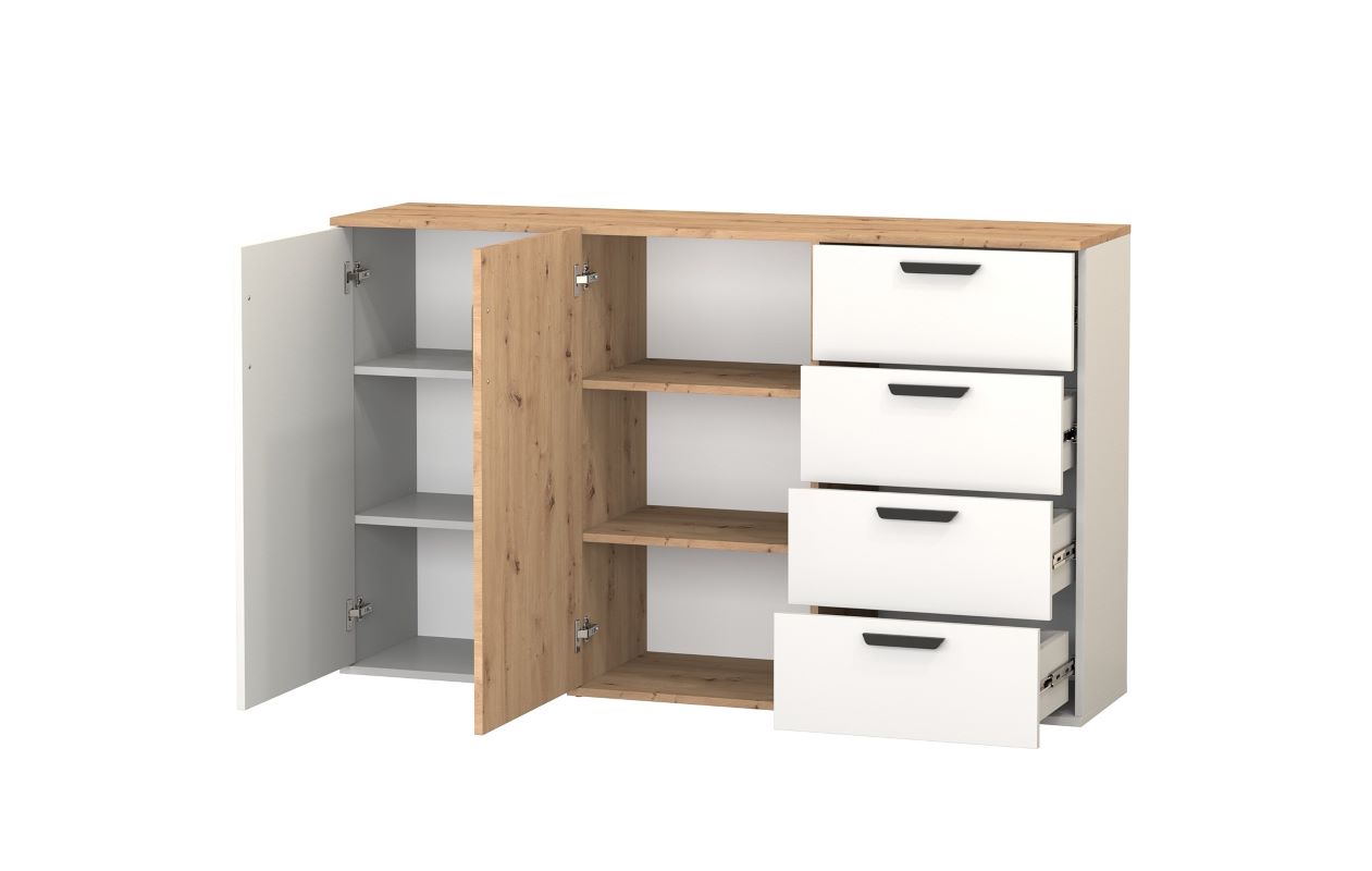 Komoda Alanis została wykonana z najwyższej jakości płyty laminowanej, co gwarantuje jej trwałość i wytrzymałość na upływający czas. Zarówno korpus, jak i fronty komody Alanis występują w dwóch eleganckich kolorach: dąb artisan oraz biały. Ten kontrastowy zestaw kolorów nadaje meblowi niezwykłego uroku, sprawiając, że pasuje zarówno do klasycznych, jak i nowoczesnych wnętrz. Matowe wykończenie dodaje komodzie subtelności i delikatności, jednocześnie chroniąc ją przed uszkodzeniami i zarysowaniami.