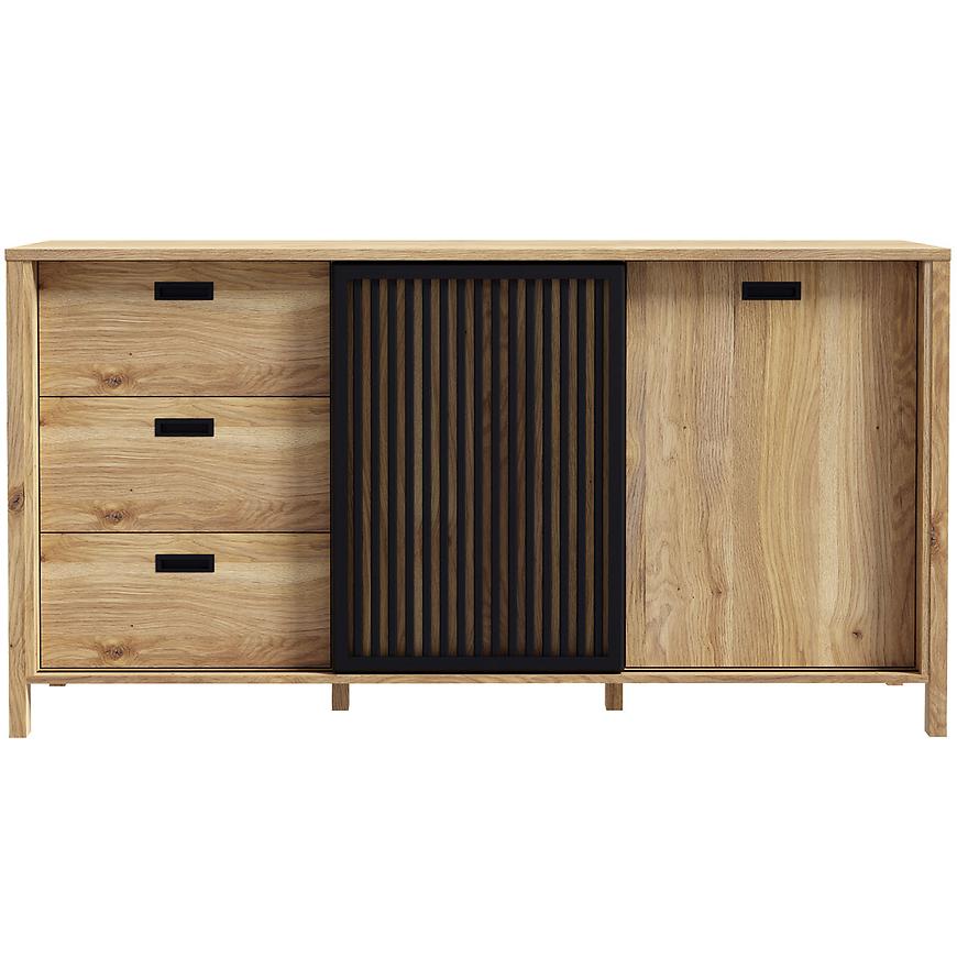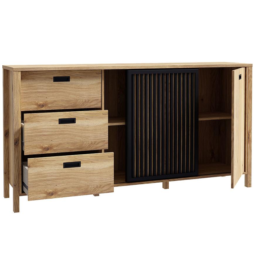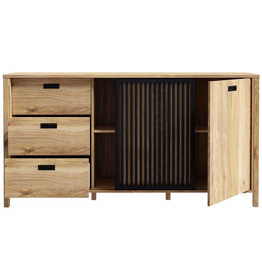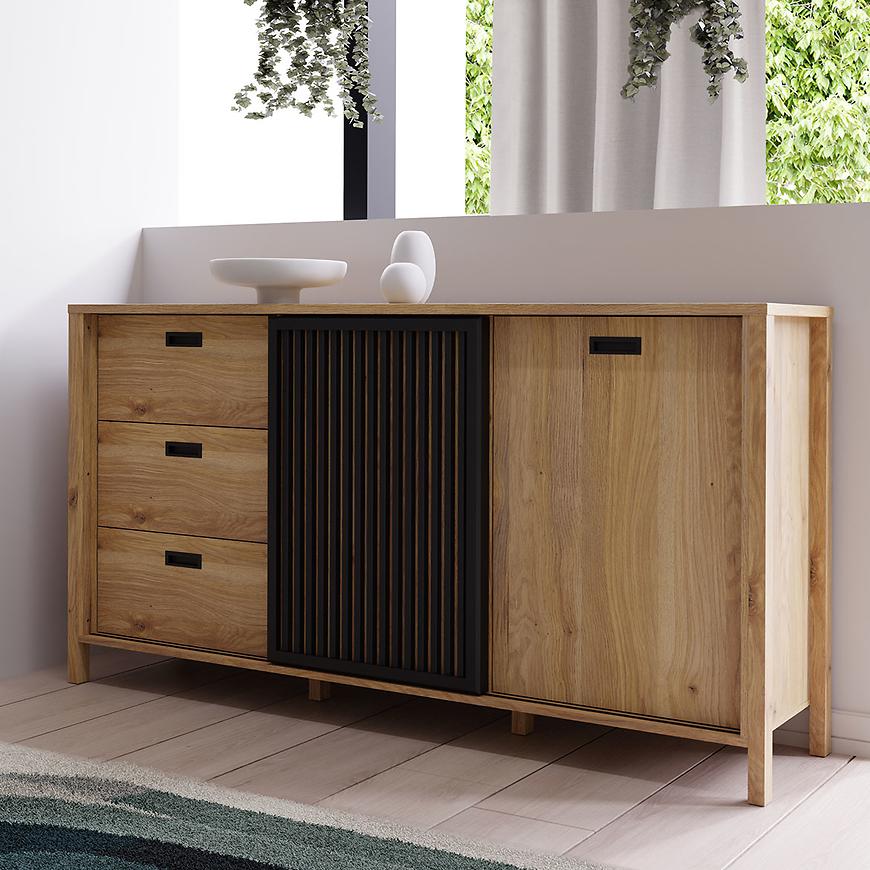 Kolor dąb mauvella w połączeniu z czarnym nadaje komodzie elegancji i nowoczesnego wyglądu. Matowe wykończenie sprawia, że komoda prezentuje się subtelnie i estetycznie. Matowa powierzchnia zapobiega odbijaniu światła, co nadaje jej eleganckiego wyglądu. Dodatkowym elementem ozdobnym są czarne lamele, które nadają komodzie charakteru i wyjątkowego wyglądu.