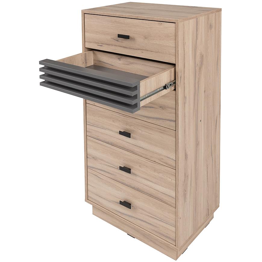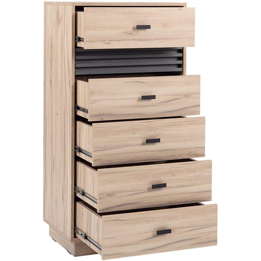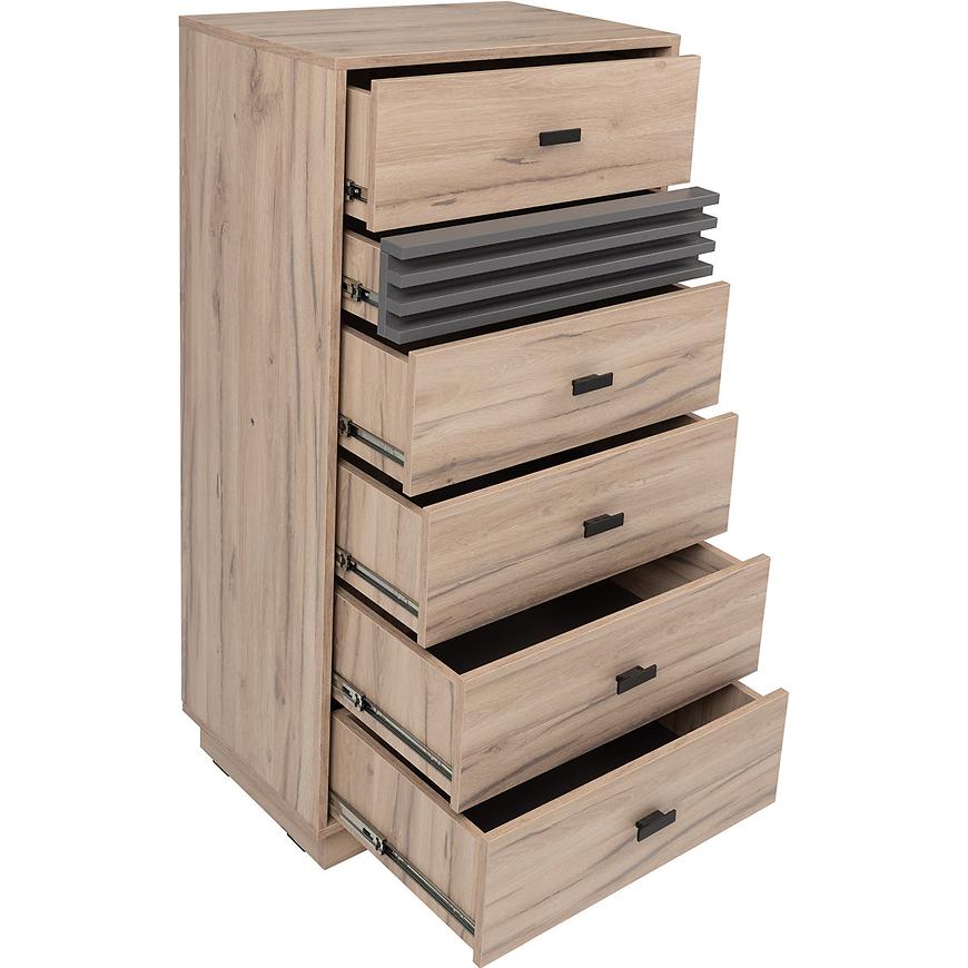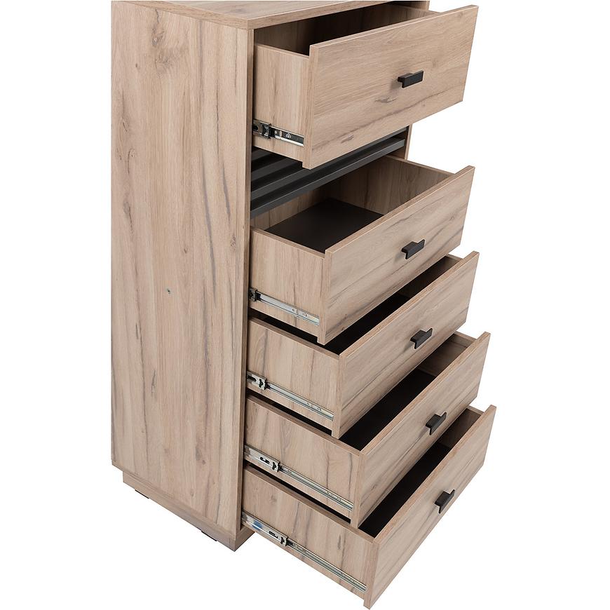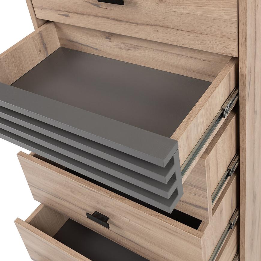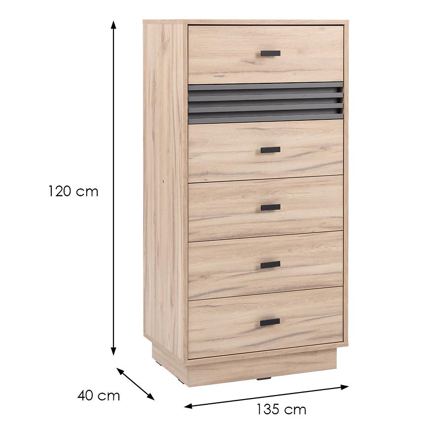 Komoda posiada sześć szuflad, która zapewnia dodatkową przestrzeń do przechowywania, umożliwiając porządkowanie drobnych przedmiotów. Kolor dąb estana jasny nadaje komodzie subtelny, naturalny wygląd, co sprawia, że doskonale współgra z różnorodnymi aranżacjami wnętrz. Matowe wykończenie nadaje meblowi elegancji i sprawia, że jest łatwy do utrzymania w czystości.