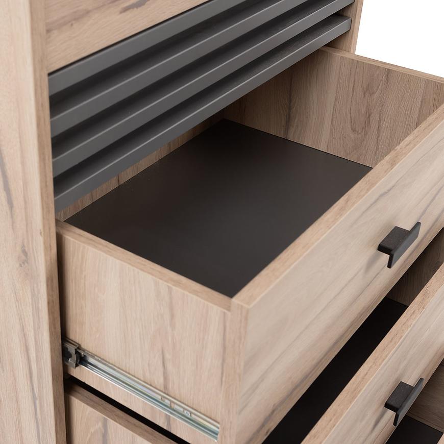 Konstrukcja komody opiera się na płycie wiórowej laminowanej, co gwarantuje trwałość i stabilność mebla. Materiały użyte do produkcji są wysokiej jakości, co sprawia, że komoda Allmo to nie tylko praktyczne, ale również trwałe rozwiązanie.