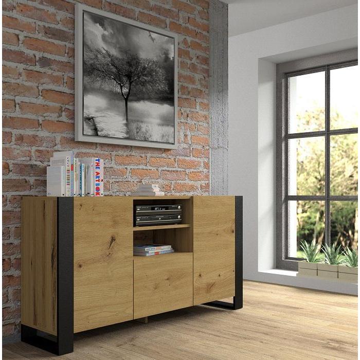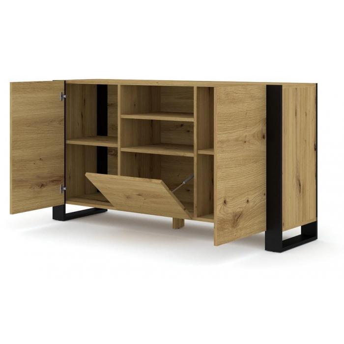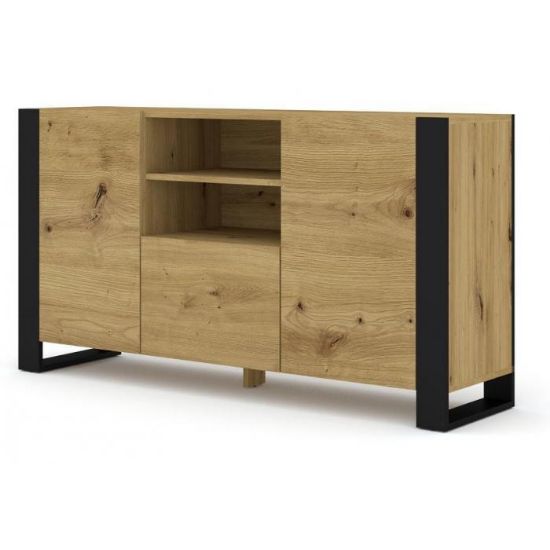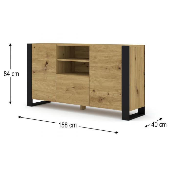 Komoda z kolekcji Apex została wykonana z płyty laminowanej 16mm oraz płyty HDF, natomiast obrzeża zostały wykonane z płyty ABS. Komoda, oprócz charakterystycznych, czarnych nóg, które gwarantują stabliność, posiada dodatkową podpórkę na środku. Komoda została wyposażona w trzy zamykane szafki oraz dwie otwarte półki. Dodatkowo posiada bezuchwytowe otwieranie.