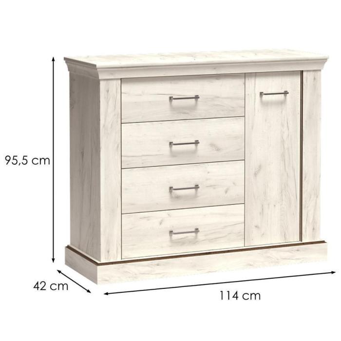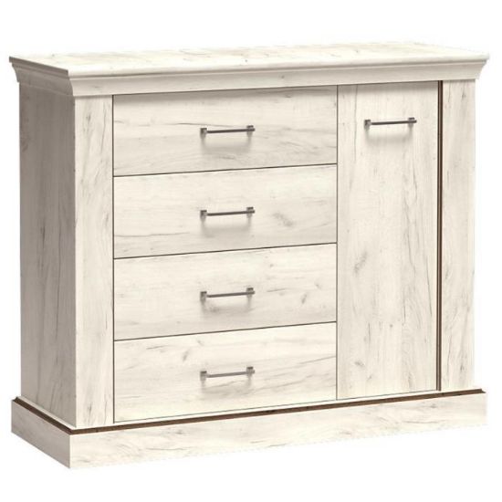 Doskonałym wyborem do pokoju dziennego będzie komoda w kolorze kraft biały z serii Apollo, materiał wykonania to płyta laminowana. Komoda posiada szafki i szuflady, dzięki czemu ma łatwy dostęp do wnętrza. Komoda dopełni również wystrój salonu, czy przedpokoju, stanowiąc wygodne miejsce do przechowywania mniejszych i większych rzeczy. Mebel do samodzielnego montażu.