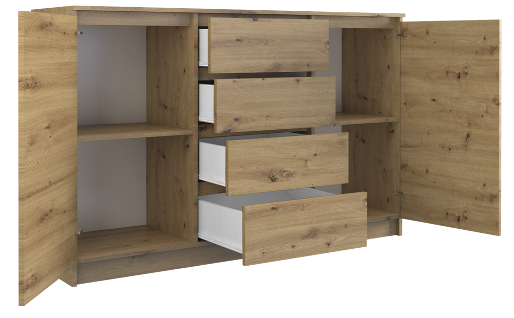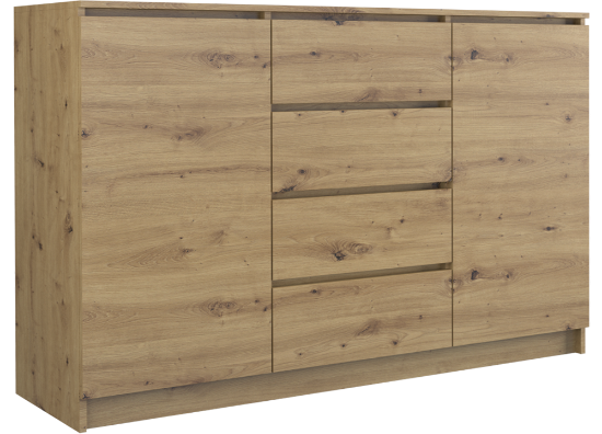 Komoda Aramis to prosta, uniwersalna i pojemna bryła, którą wyróżnia również bardzo ergonomiczna konstrukcja. Cztery szuflady umieszczonych pomiędzy dwoma parami drzwi dają wyjątkowo dużą przestrzeń do przechowywania. Komoda posiada funkcjonalny blat, który można wykorzystać np. charakterze miejsca na telewizor (szczególnie w pomieszczeniach, w których nie ma przestrzeni na tradycyjną szafkę RTV). Idealna komoda do salonu w stylu scandi lub nowoczesnej sypialni! Płyta laminowana o grubości 16 mm zapewnia solidność i wytrzymałość. Mebel do samodzielnego montażu.