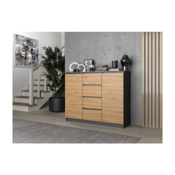 Jeśli szukasz uniwersalnej komody, która będzie charakteryzowała się nie tylko funkcjonalnością, ale i modnym designem, sprawdź walory komody Aramis! W pojemnych szufladach zmieszczą się dokumenty, bielizna, drobne sztuki odzieży i wszelkie potrzebne w każdym domu przedmioty. Dzięki temu wykorzystać ją można jako komodę do biura, salonu, sypialni, a nawet przedpokoju. Prosty, wyraźnie nawiązujący do stylu nowoczesnego design oraz kolory sprawiają, że komoda Aramisstanowi doskonałą podstawę dalszych aranżacji. Co równie ważne, mebel został wykonany z najwyższej jakości płyt laminowanych o grubości, dzięki czemu jest wytrzymały, odporny na uszkodzenia, a także łatwy do utrzymania w czystości. Mebel do samodzielnego montażu.