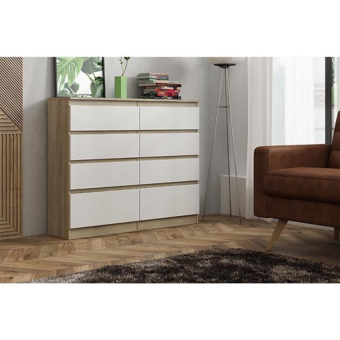 Doskonałym wyborem do pokoju dziennego będzie komoda w kolorze biały/dąb sonoma z serii Ariel, materiał wykonania to płyta laminowana. Komoda posiada szuflady, dzięki czemu ma łatwy dostęp do wnętrza. Komoda dopełni również wystrój salonu, czy przedpokoju, stanowiąc wygodne miejsce do przechowywania mniejszych i większych rzeczy. Mebel do samodzielnego montażu.