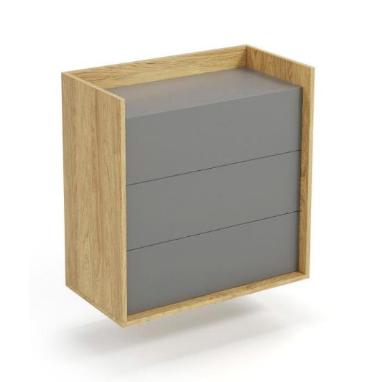 Doskonałym wyborem do pokoju dziennego będzie komoda w kolorze hikora naturalna/szary przykurzony z serii Arka, materiał wykonania to płyta meblowa okleinowana gr.18 mm, obrzeża abs. Komoda posiada szuflady z systemem otwierania push-click, dzięki czemu ma łatwy dostęp do wnętrza. Komoda dopełni również wystrój salonu, czy przedpokoju, stanowiąc wygodne miejsce do przechowywania mniejszych i większych rzeczy. Mebel do samodzielnego montażu.