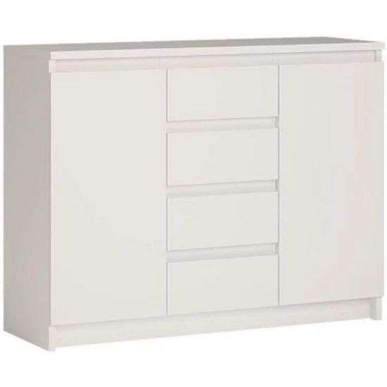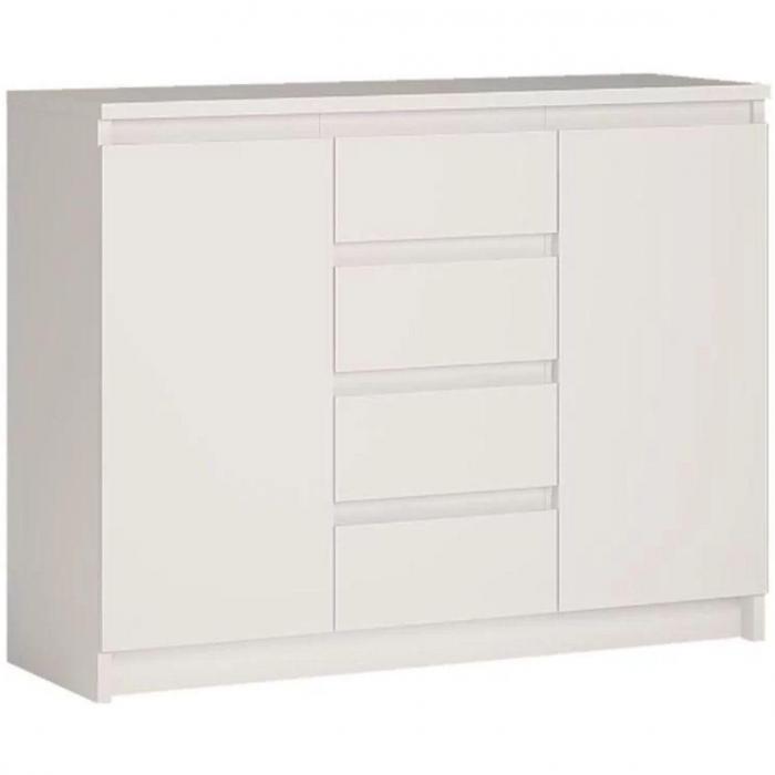 Doskonałym wyborem do pokoju dziennego będzie biała komoda z serii Armadio, materiał wykonania to płyta laminowana. Komoda posiada szafki oraz szuflady, dzięki czemu ma łatwy dostęp do wnętrza. Komoda dopełni również wystrój salonu, czy przedpokoju, stanowiąc wygodne miejsce do przechowywania mniejszych i większych rzeczy. Mebel do samodzielnego montażu.
