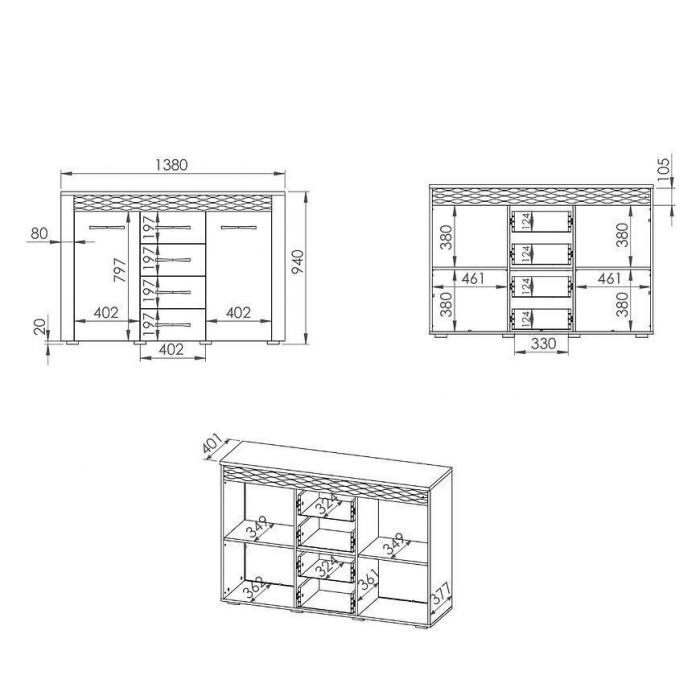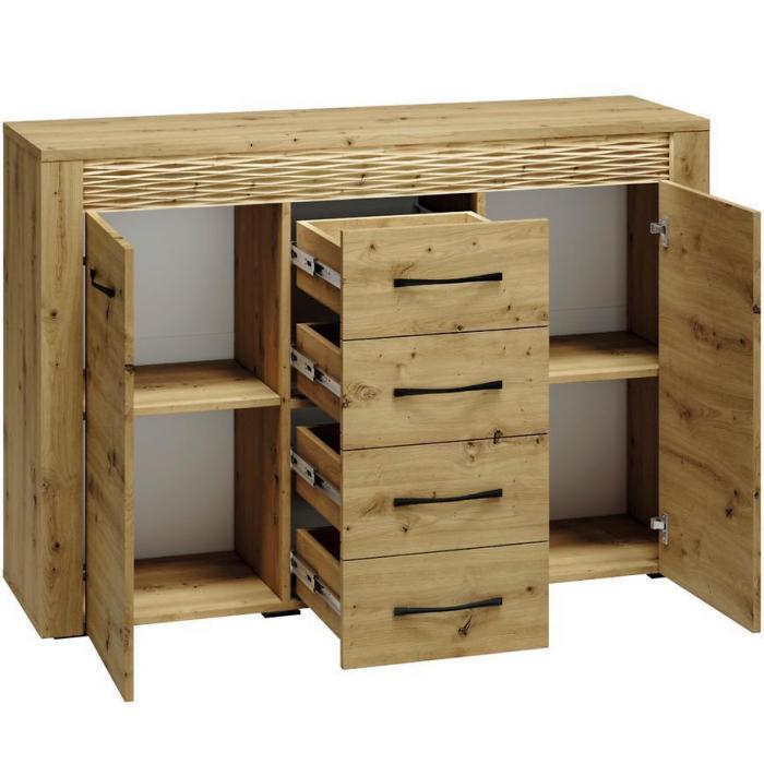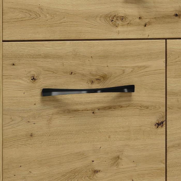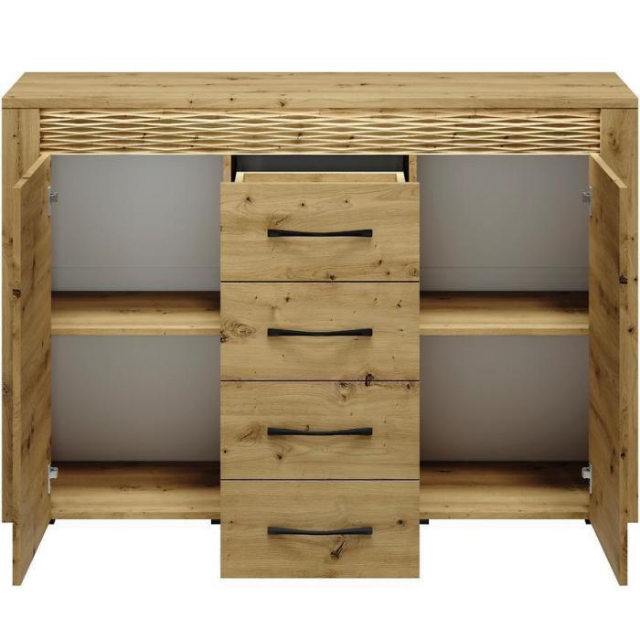 Doskonałym wyborem do pokoju dziennego będzie komoda w kolorze dąb artisan z serii Artis, materiał wykonania to płyta laminowana. Komoda posiada szafki oraz szuflady, dzięki czemu ma łatwy dostęp do wnętrza. Dodatkowym atutem jest oświetlenie w zestawie. Komoda dopełni również wystrój salonu, czy przedpokoju, stanowiąc wygodne miejsce do przechowywania mniejszych i większych rzeczy. Mebel do samodzielnego montażu.