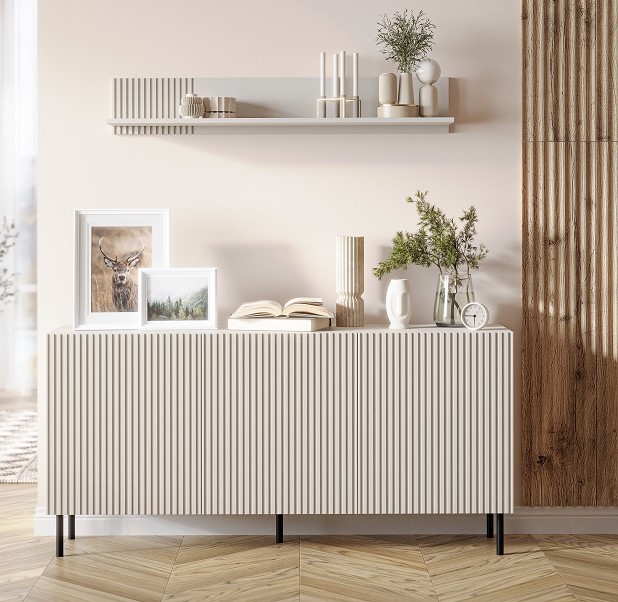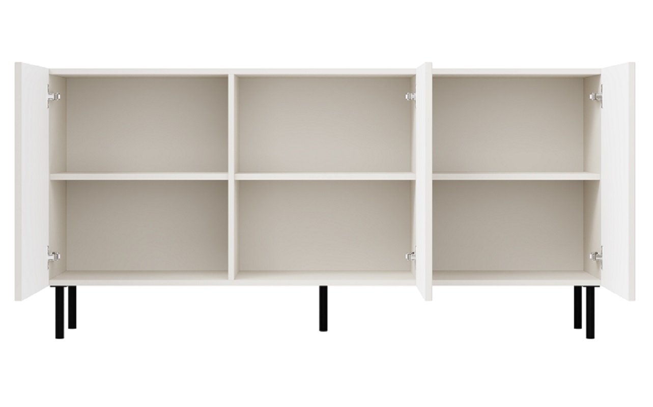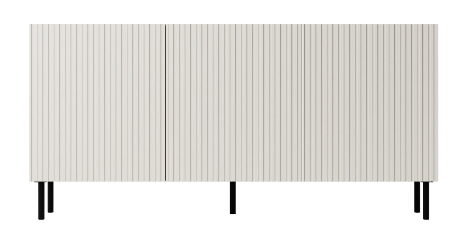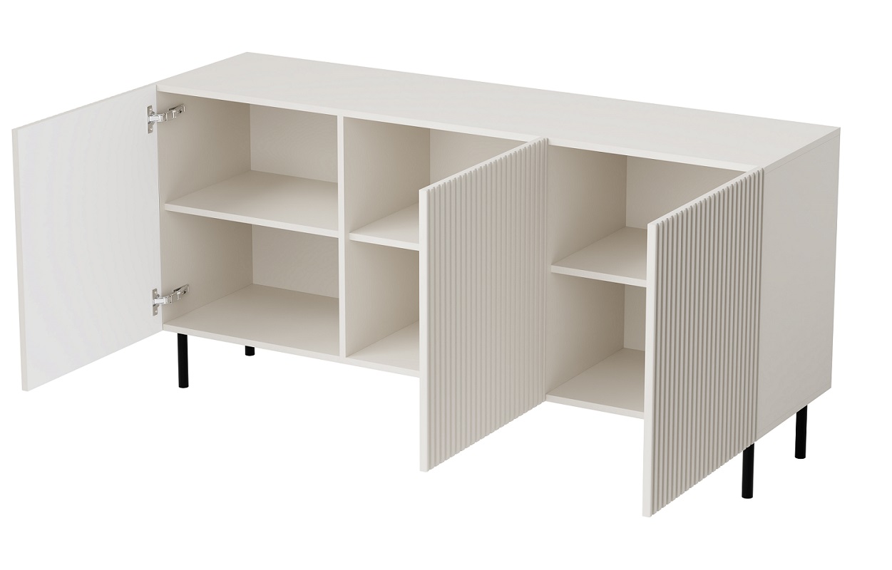 Doskonałym wyborem do pokoju dziennego będzie komoda Aruba A2 w kolorze kaszmir mat. Komoda wykonana z płyty wiórowej laminowanej, fronty wykonane z MDF-u, płaszczowane folią PCV z widocznymi frezami. Komoda posiada potrójne, uchylne drzwi, za drzwiami znajduja się trzy półki. Nóżki wykonane z metalu w kolorze czarnym o wysokosci 15 cm. Wysokość całkowita komody uwzględnia wysokość nóżek. Komoda dopełni również wystrój przedpokoju, stanowiąc wygodne miejsce do przechowywania mniejszych i większych rzeczy. Mebel do samodzielnego montażu.
