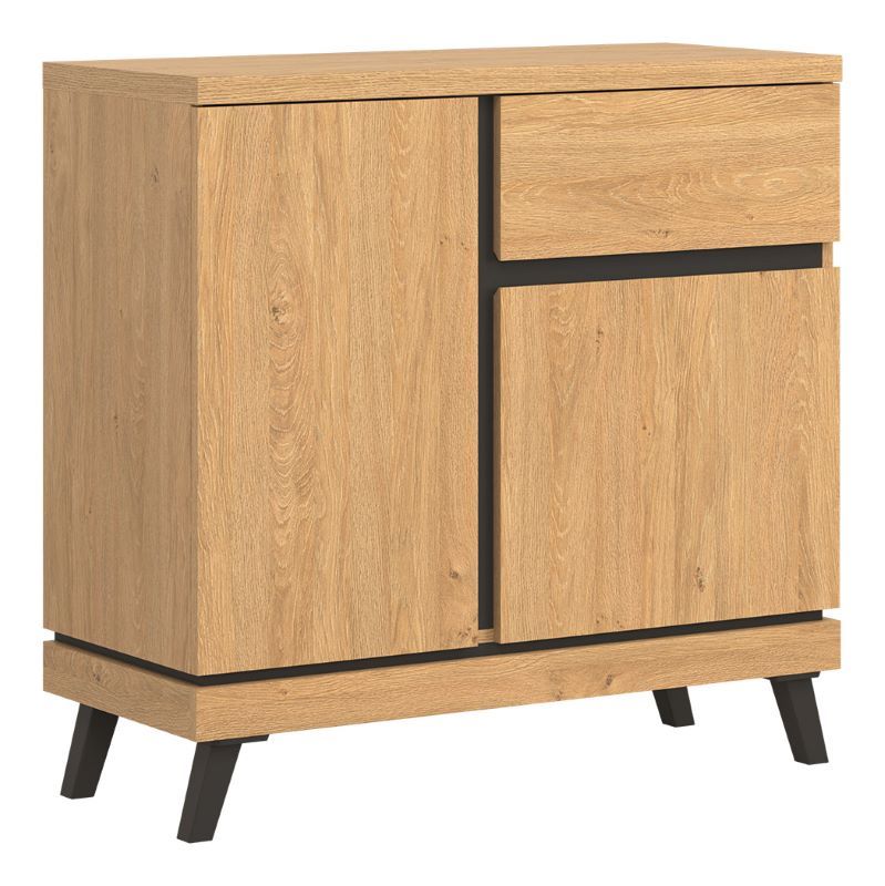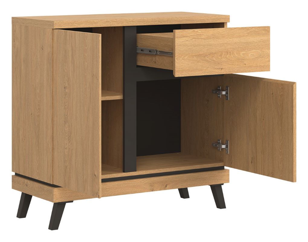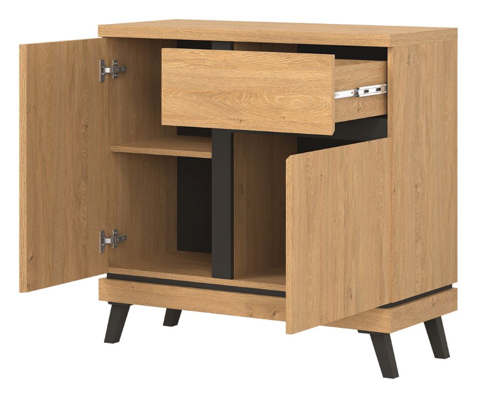 Komoda ATE AT02 doskonale sprawdzi się w każdym pomieszczeniu. Bryła została wyposażona w szufladę oraz dwie wnęki ukryte za drzwiczkami. To funkcjonalne rozwiązanie umożliwi przechowywanie przedmiotów w rozmaity sposób.