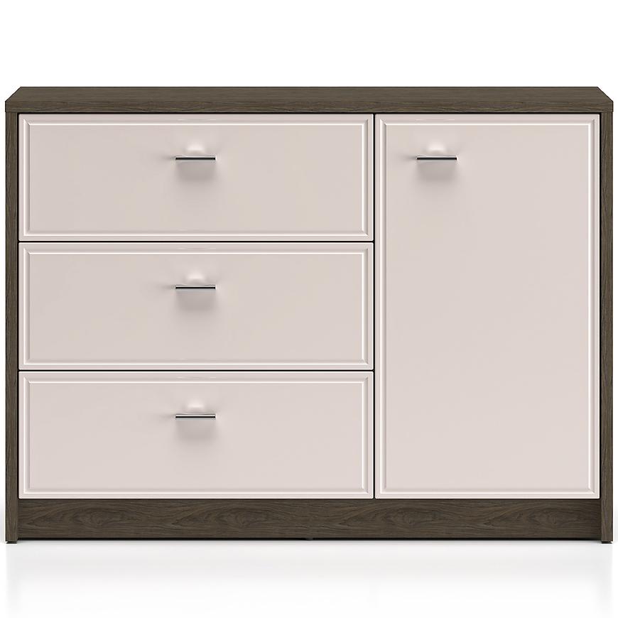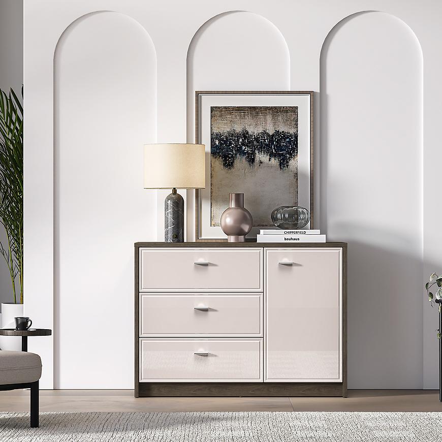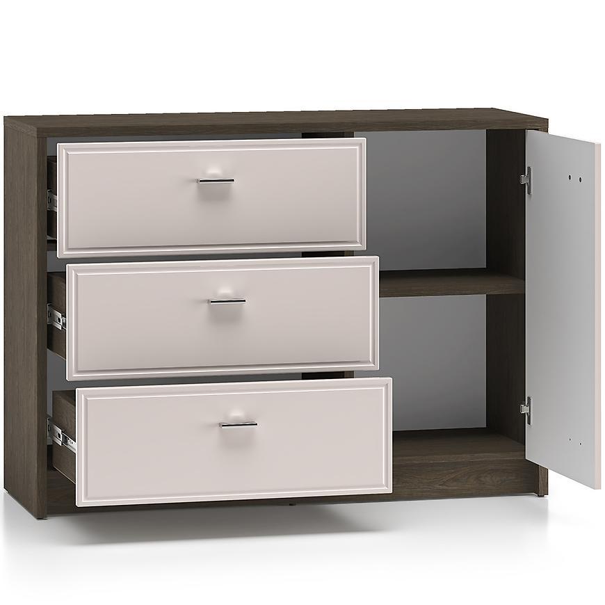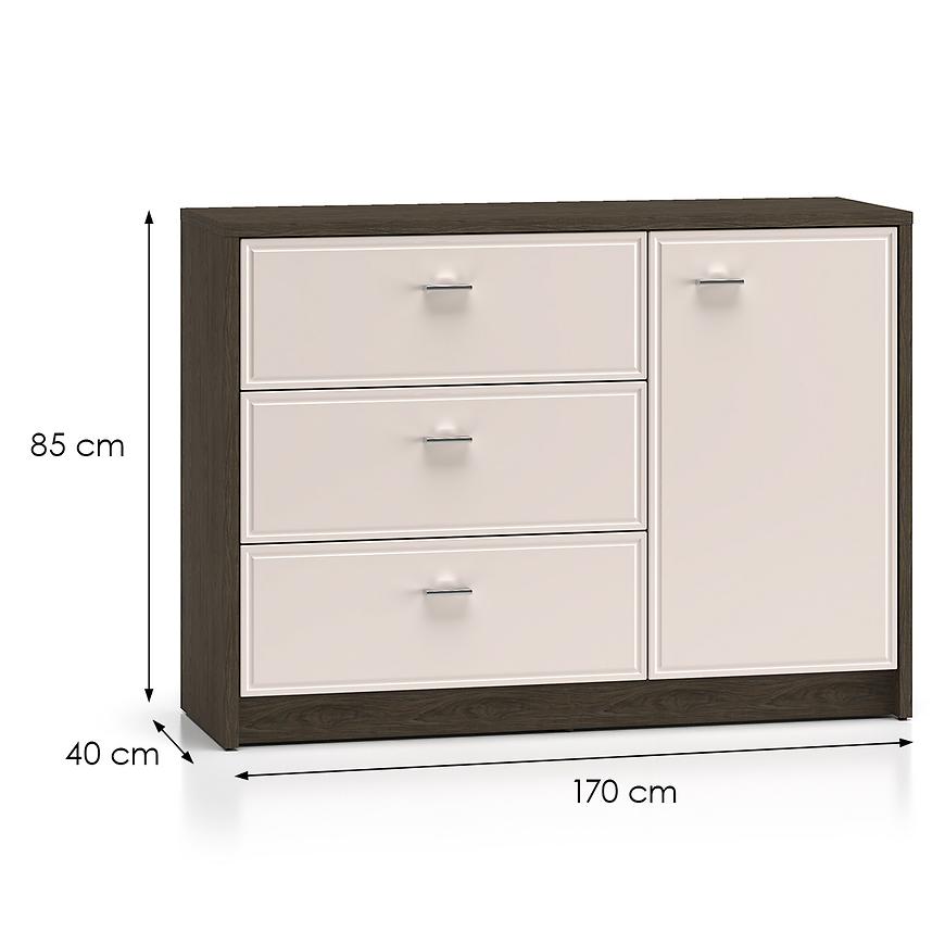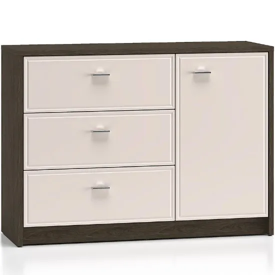 Komoda Avante 05 w eleganckim połączeniu koloru dąb Windmill Dark i cashmere to stylowy i praktyczny mebel do klasycznego wnętrza. Posiada 1 drzwi i 3 pojemne szuflady, które zapewniają wygodne przechowywanie. Fronty z płyty MDF w połysku kontrastują z matowym korpusem z laminowanej płyty wiórowej. Idealna do salonu, sypialni.