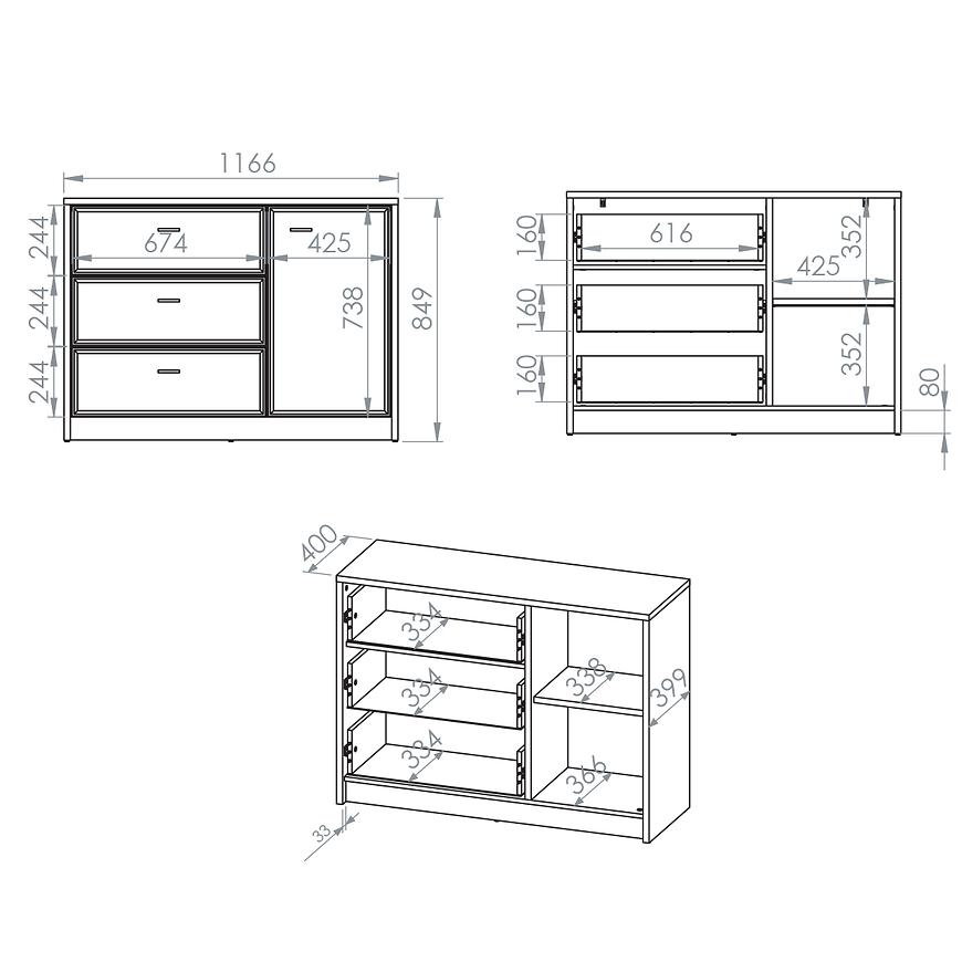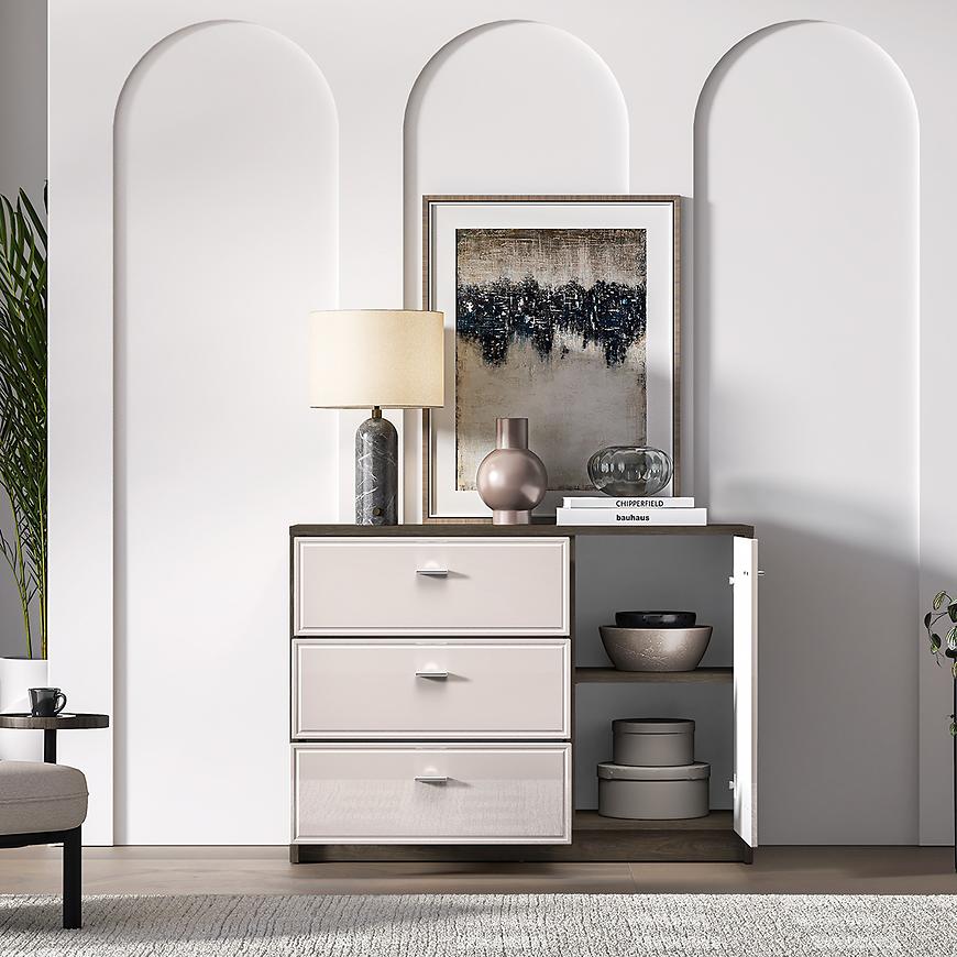 komoda jednodrzwiowa z trzema szufladami oraz komoda dwudrzwiowa z trzema szufladami – meble oferujące dużo miejsca do przechowywania w eleganckiej formie,