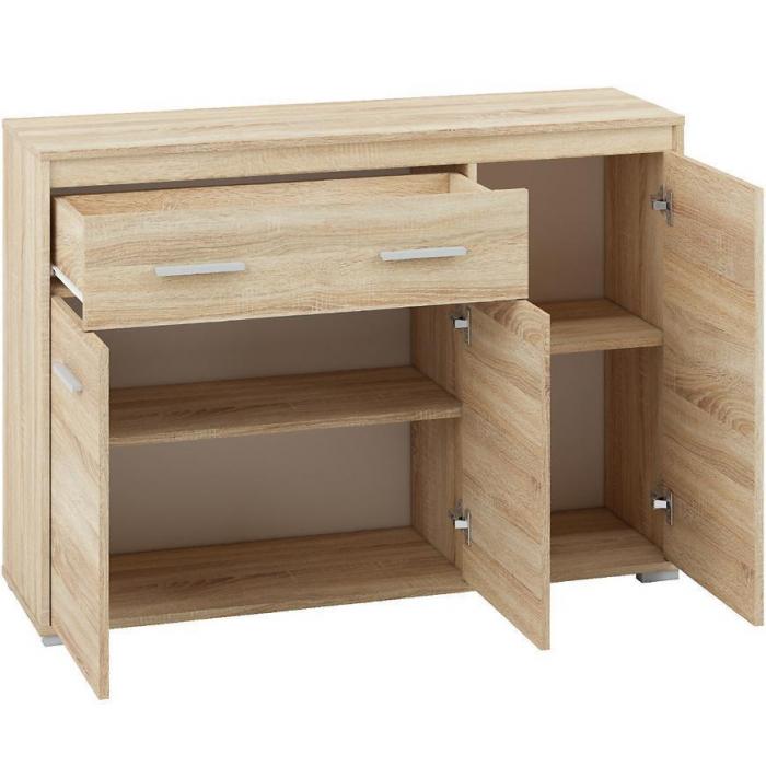 Doskonałym wyborem do pokoju dziennego będzie komoda w kolorze dąb sonoma z serii Avo, materiał wykonania to płyta laminowana. Komoda posiada szafki oraz szuflady dzięki czemu ma łatwy dostęp do wnętrza. Komoda dopełni również wystrój salonu, czy przedpokoju, stanowiąc wygodne miejsce do przechowywania mniejszych i większych rzeczy. Mebel do samodzielnego montażu.