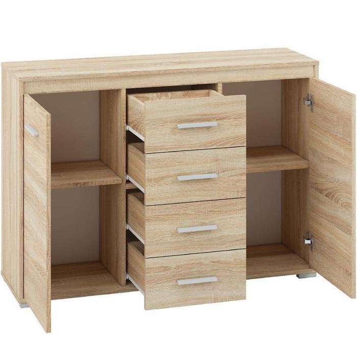 Doskonałym wyborem do pokoju dziennego będzie komoda w kolorze dąb sonoma z serii Avo, materiał wykonania to płyta laminowana. Komoda posiada szafki oraz szuflady dzięki czemu ma łatwy dostęp do wnętrza. Komoda dopełni również wystrój salonu, czy przedpokoju, stanowiąc wygodne miejsce do przechowywania mniejszych i większych rzeczy. Mebel do samodzielnego montażu.