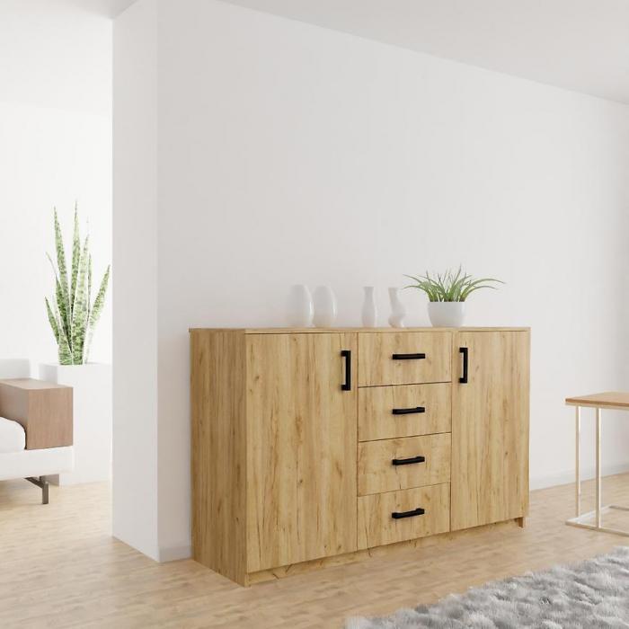 Doskonałym wyborem do pokoju dziennego będzie komoda w kolorze dąb wotan z serii Bahli, materiał wykonania płyta laminowana. Komoda Bahli to niezbędny mebel w każdym domu. Praktyczna dzięki szafkom i szufladom zadowoli każdego użytkownika. Klasyczny kształt sprawi, że będzie pasowała do wielu wnętrz. Kolorystyka drewnopodobna wpasuje się w jasne i neutralne aranżacje. Idealny mebel do salonu, sypialni, pokoju dziennego lub innych pomieszczeń. To wygodne miejsce do przechowywania mniejszych i większych rzeczy. Meble do samodzielnego montażu.