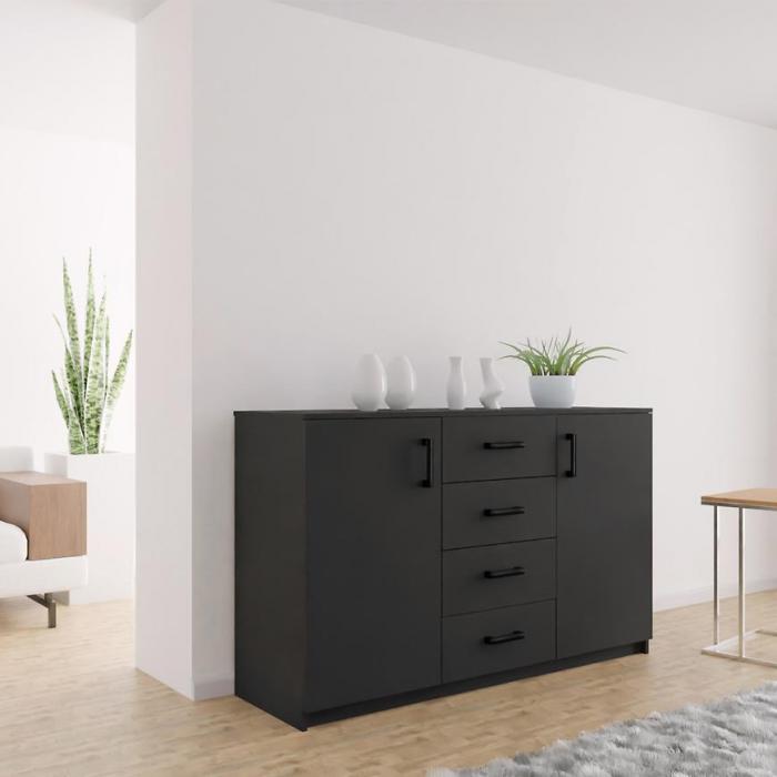 Doskonałym wyborem do pokoju dziennego będzie komoda w kolorze czarnym. Komoda Bahli to niezbędny mebel w każdym domu. Praktyczna dzięki szafkom i szufladom zadowoli każdego użytkownika. Czarny kolor sprawia, że będzie pasowała do nowoczesnych wnętrz jak również do tych urządzonych w stylu industrialnym. Idealny mebel do salonu, sypialni, pokoju dziennego lub innych pomieszczeń.To wygodne miejsce do przechowywania mniejszych i większych rzeczy. Meble do samodzielnego montażu.