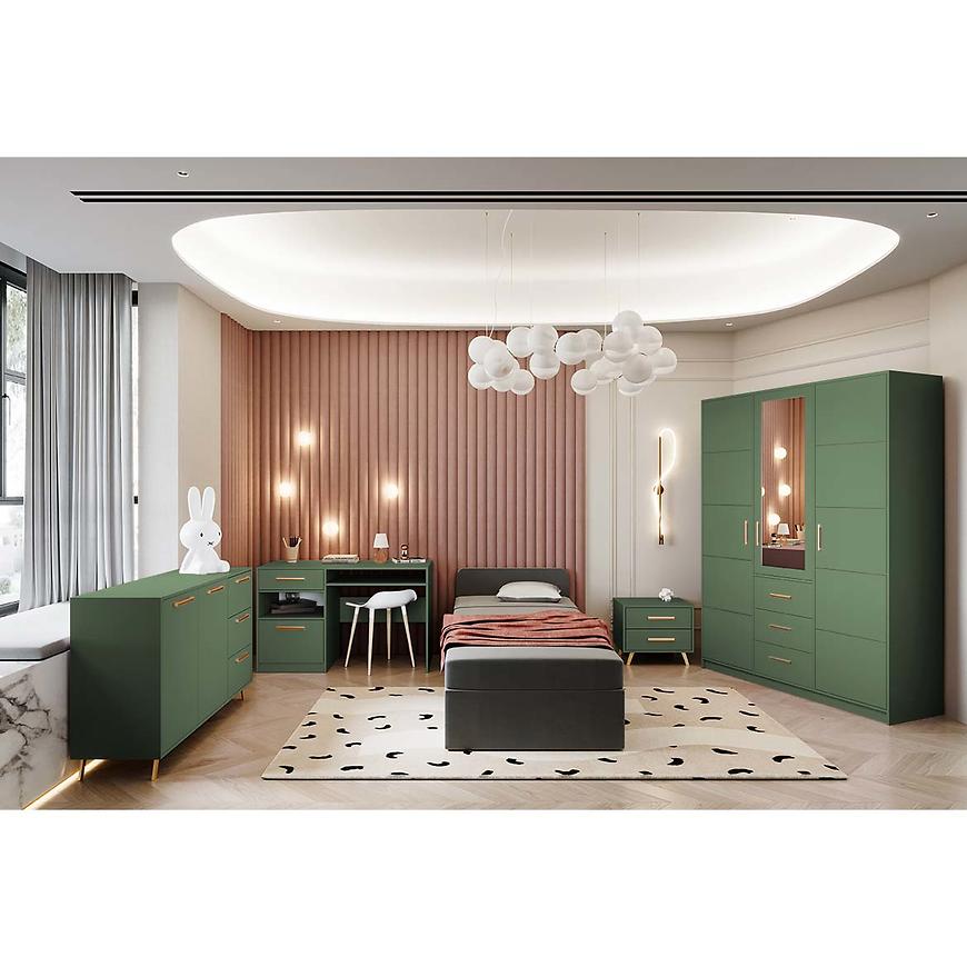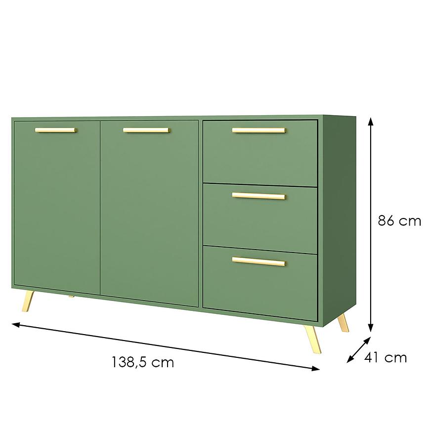 Kolor butelkowej zieleni nadaje komodzie naturalnego uroku, podkreślając jednocześnie nowoczesny charakter. Matowe wykończenie dodaje elegancji, a konstrukcja z płyty wiórowej laminowanej zapewnia trwałość i solidność na lata.