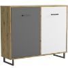 Komoda Bari 2F w kolorze dąb artisan/grafit/biały idealnie sprawdzi pokoju młodzieżowym, a także w salonie, jadalni czy w innym, dowolnym pomieszczeniu. Posiada dużo miejsca do przechowywania. Komoda posiada dwie szafki. Całość została wykonana z płyty wiórowej laminowanej. Mebel do samodzielnego montażu.