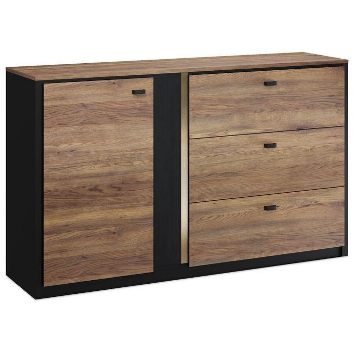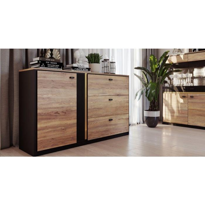 Doskonałym wyborem do pokoju dziennego będzie komoda w kolorze dąb wersal/czarny z serii Belize, materiał wykonania to płyta laminowana. Komoda posiada szafki i szuflady dzięki czemu ma łatwy dostęp do wnętrza. Komoda dopełni również wystrój salonu, czy przedpokoju, stanowiąc wygodne miejsce do przechowywania mniejszych i większych rzeczy. Mebel do samodzielnego montażu.