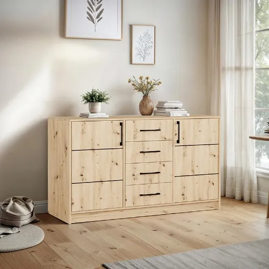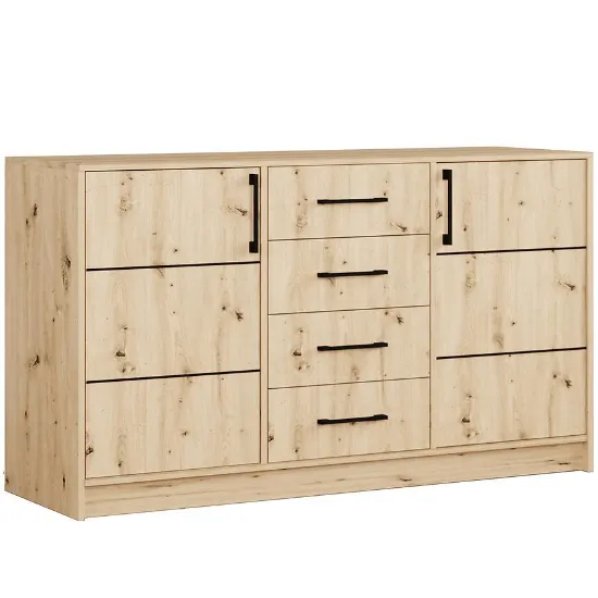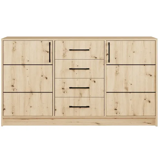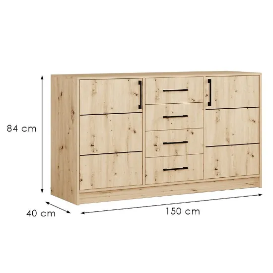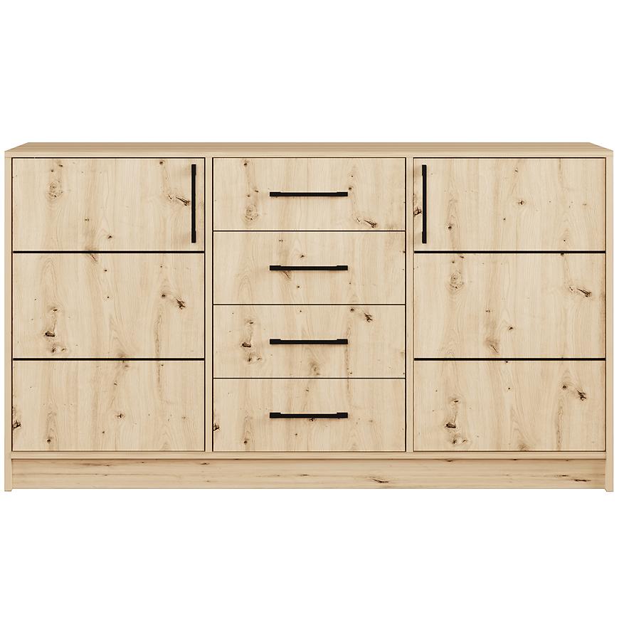 Model z kolekcji BELLUNO został wyposażony w dwoje drzwi oraz cztery pojemne szuflady, które zapewniają mnóstwo miejsca do przechowywania – od ubrań po dokumenty czy akcesoria codziennego użytku. Korpus i fronty wykonane zostały z wytrzymałej płyty wiórowej laminowanej, co gwarantuje trwałość, a matowe wykończenie nadaje całości elegancki, stonowany wygląd.