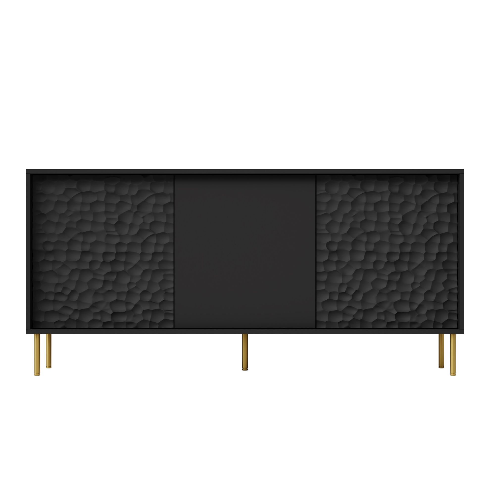 Komoda Blacky w czarnym kolorze ze złotymi metalowymi nóżkami to idealny wybór dla tych, którzy cenią sobie nowoczesny design połączony z funkcjonalnością. Wykonana z wysokiej jakości materiałów, komoda ta wyróżnia się nie tylko estetycznym wyglądem, ale także solidną konstrukcją.