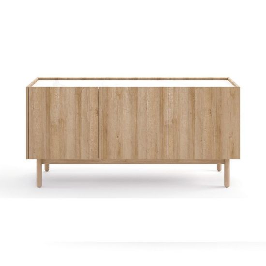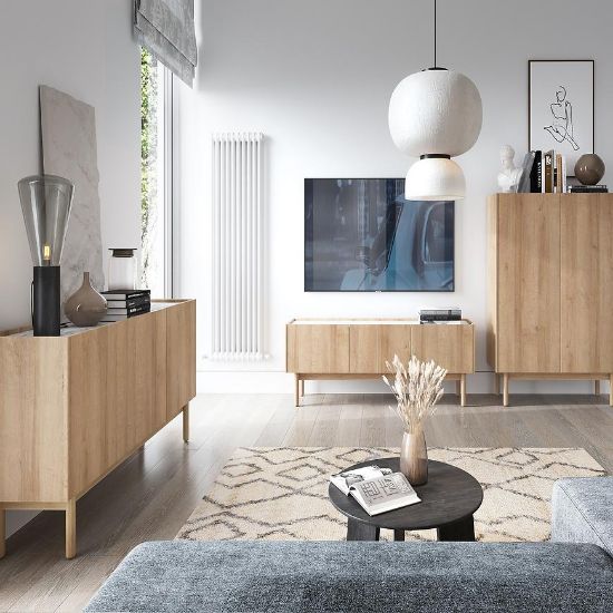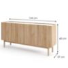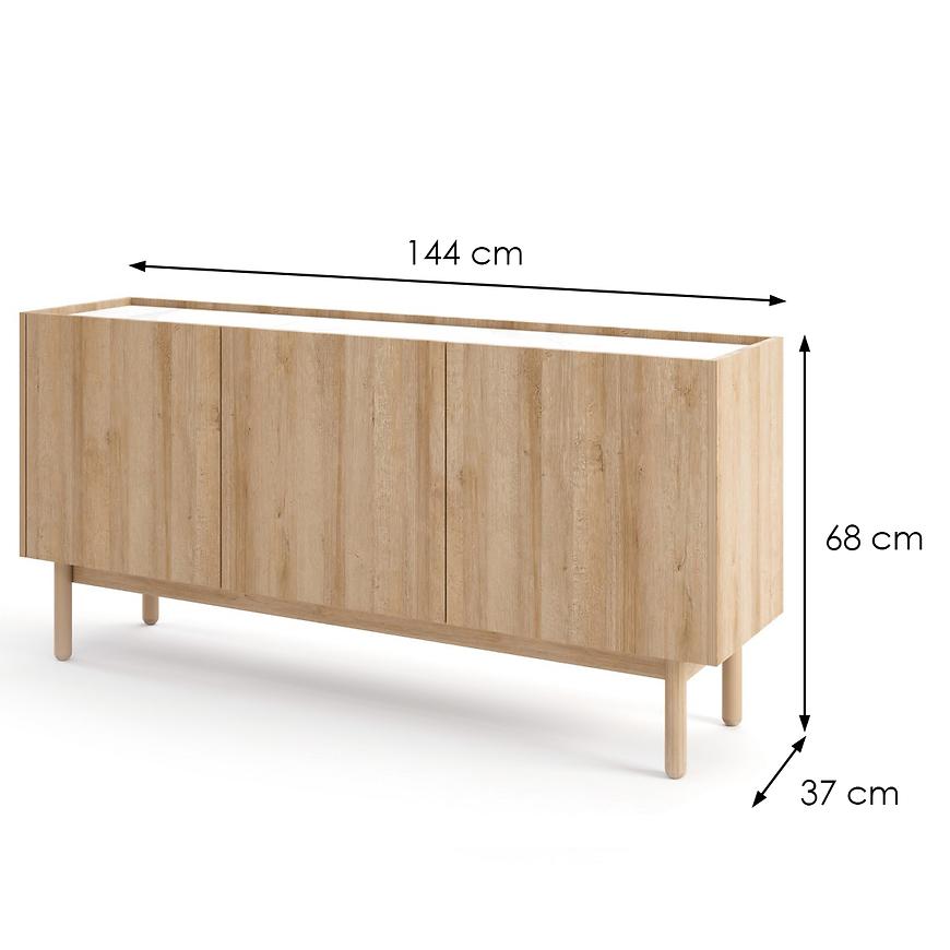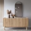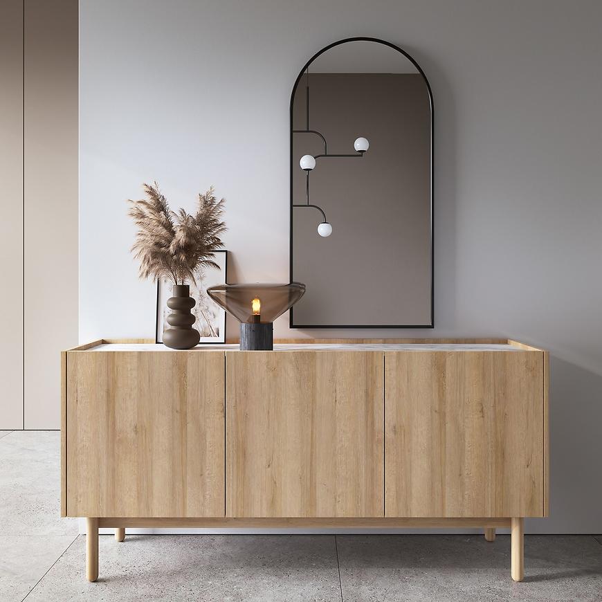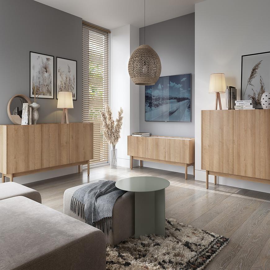 Trzydrzwiowa komoda BOHO oferuje obszerną przestrzeń do przechowywania, umożliwiając efektywne zarządzanie domowym dobytkiem. Wewnątrz znajdują się półki, które pomogą zorganizować przestrzeń i utrzymać porządek w przedmiotach codziennego użytku, od tekstyliów po akcesoria domowe.