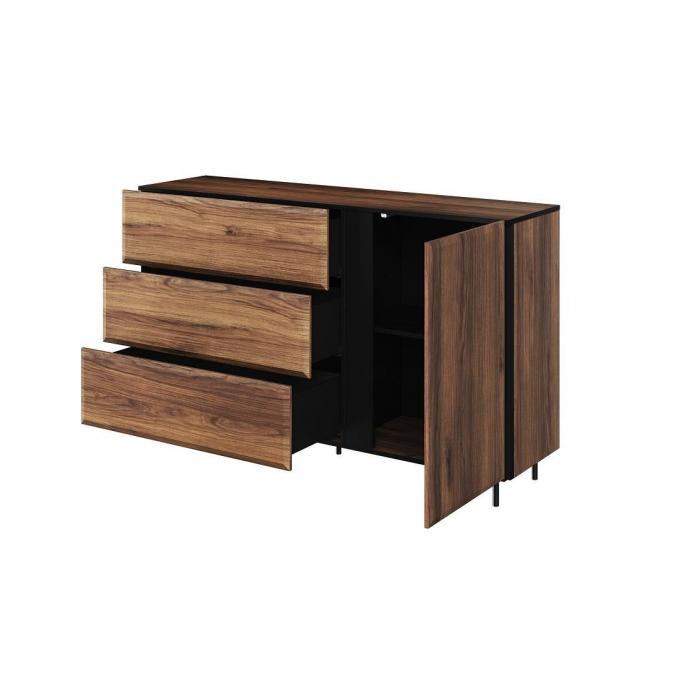 Duża i pojemna komoda Borga BG-07 w stylu nowoczesnej elegancji. Oryginalny styl mebla to zasługa charakterystycznych, dzielonych frontów z ciekawie frezowanymi krawędziami. O wygodne otwieranie szuflad zadbał system push to open i/lub soft close. Mebel wspiera się na lekkich, bardzo smukłych nóżkach. Połączenie czerni z dekorem w kolorze ciemnego drewna prezentuje się modnie, stylowo, a jednocześnie wprowadza do wnętrza dużo przytulnego ciepła.