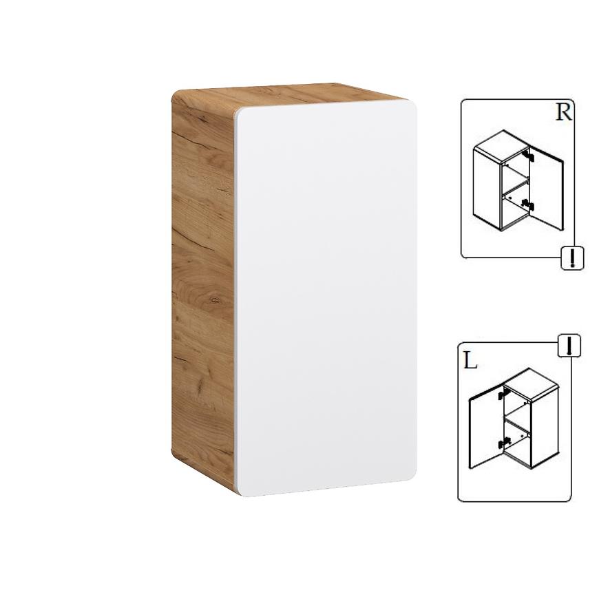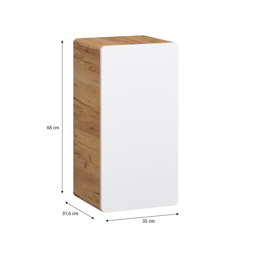 Komoda Bronx 35 dąb craft-biały to podwieszana szafka łazienkowa z kolekcji Bronx o wymiarach 68 × 35 × 31,6 cm. Front wykonany z płyty MDF pokrytej folią PVC w kolorze biały połysk, korpus z płyty wiórowej w dekorze dąb craft. Posiada 1 drzwi, 2 półki, system samodomykania i frezowane uchwyty – nie wymaga dodatkowych uchwytów. Szafka przeznaczona do samodzielnego montażu, waga 12,5 kg.