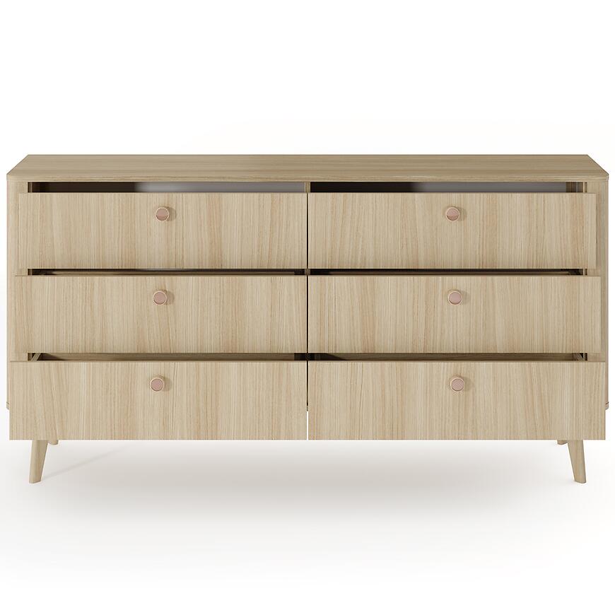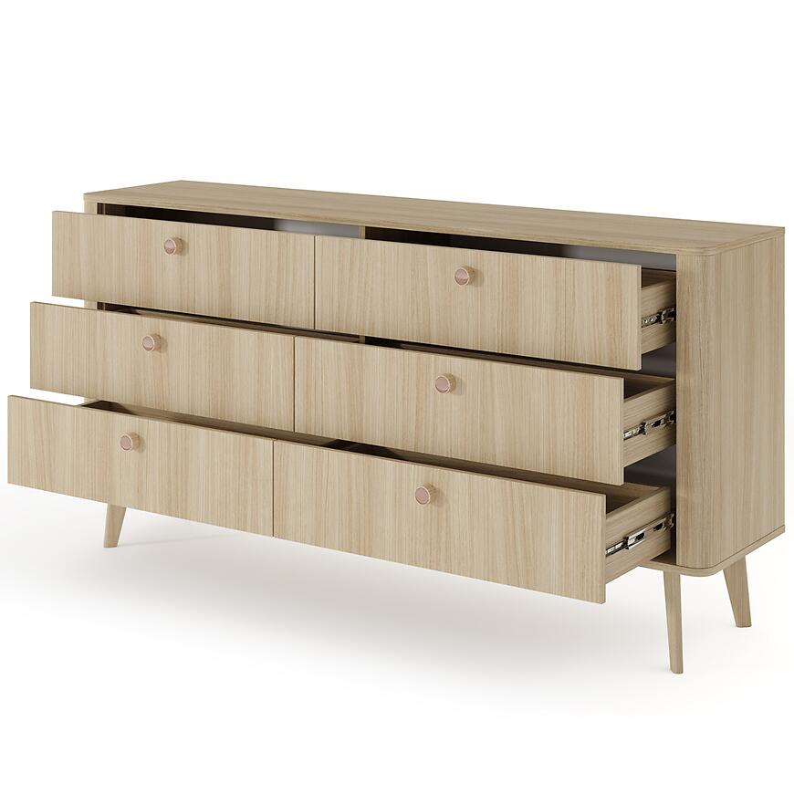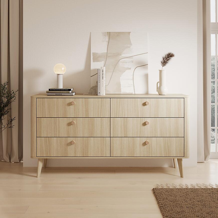 Komoda posiada 6 szuflad, które umożliwiają wygodne przechowywanie ubrań, dokumentów lub drobnych przedmiotów codziennego użytku. Każda szuflada została zaprojektowana tak, aby zapewnić płynne i ciche użytkowanie, co zwiększa komfort codziennego korzystania. Dzięki dużej liczbie szuflad możesz łatwo utrzymać porządek w mieszkaniu, a przedmioty codziennego użytku będą zawsze pod ręką.
