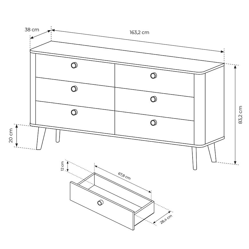 Wymiary 163,2 × 83,2 × 38 cm sprawiają, że komoda jest zarówno pojemna, jak i kompaktowa.